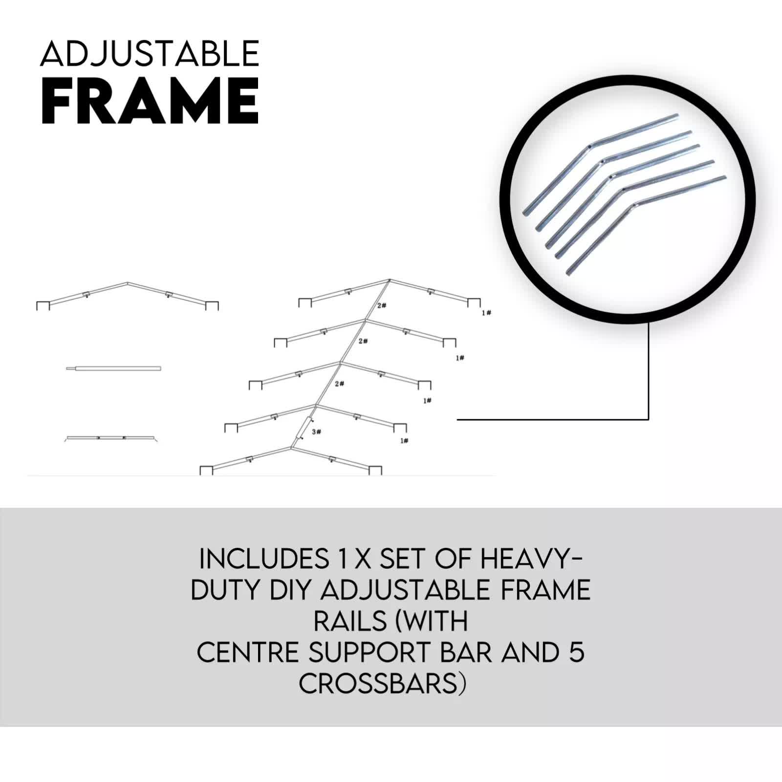 - Includes 1 x set of Heavy Duty DIY adjustable frame rails (with centre support bar and 5 crossbars)