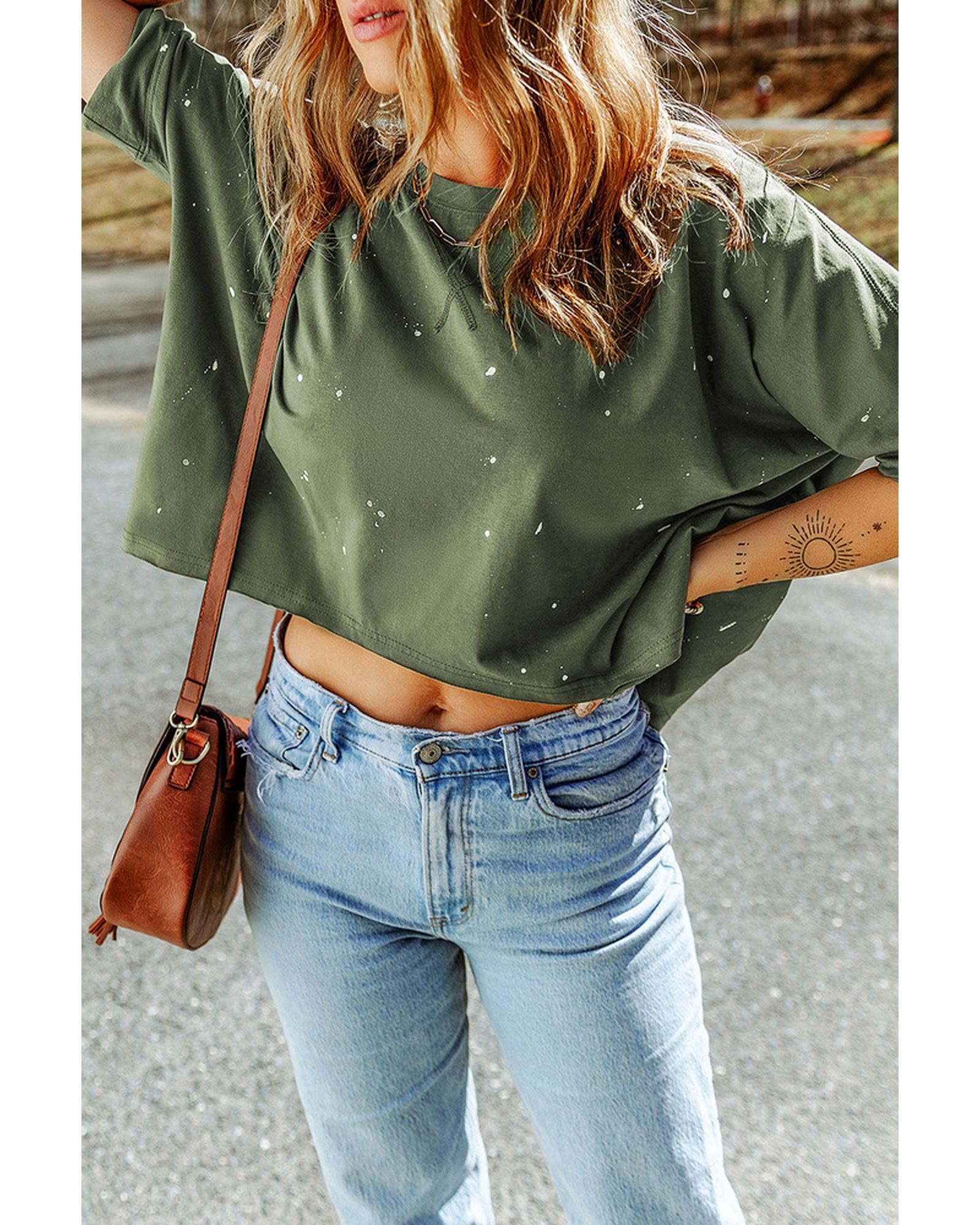 - Stylish and edgy Distressed Bleached Asymmetric Hem Short Sleeve Top
