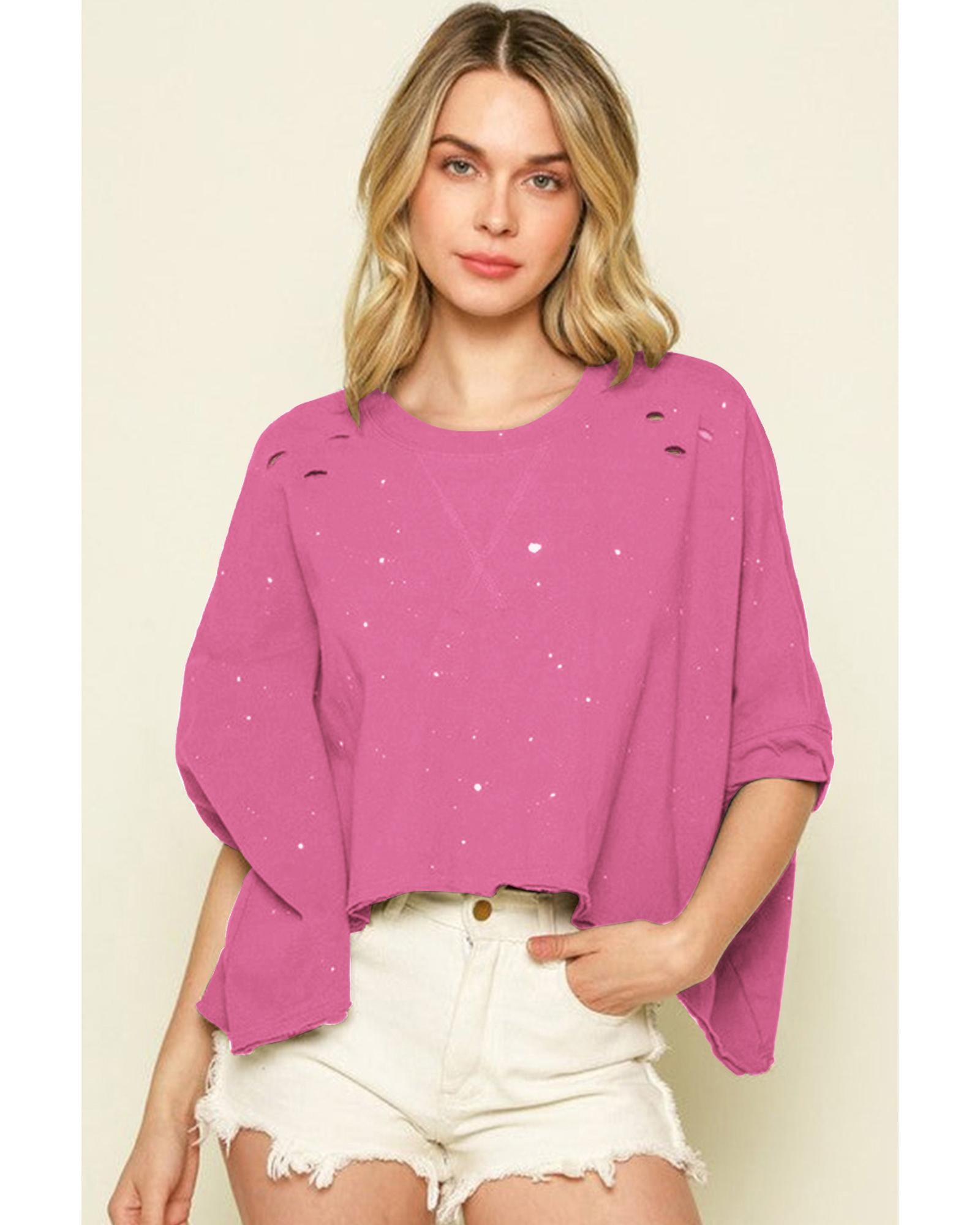 - Trendy and stylish Distressed Bleached Asymmetric Hem Short Sleeve Top