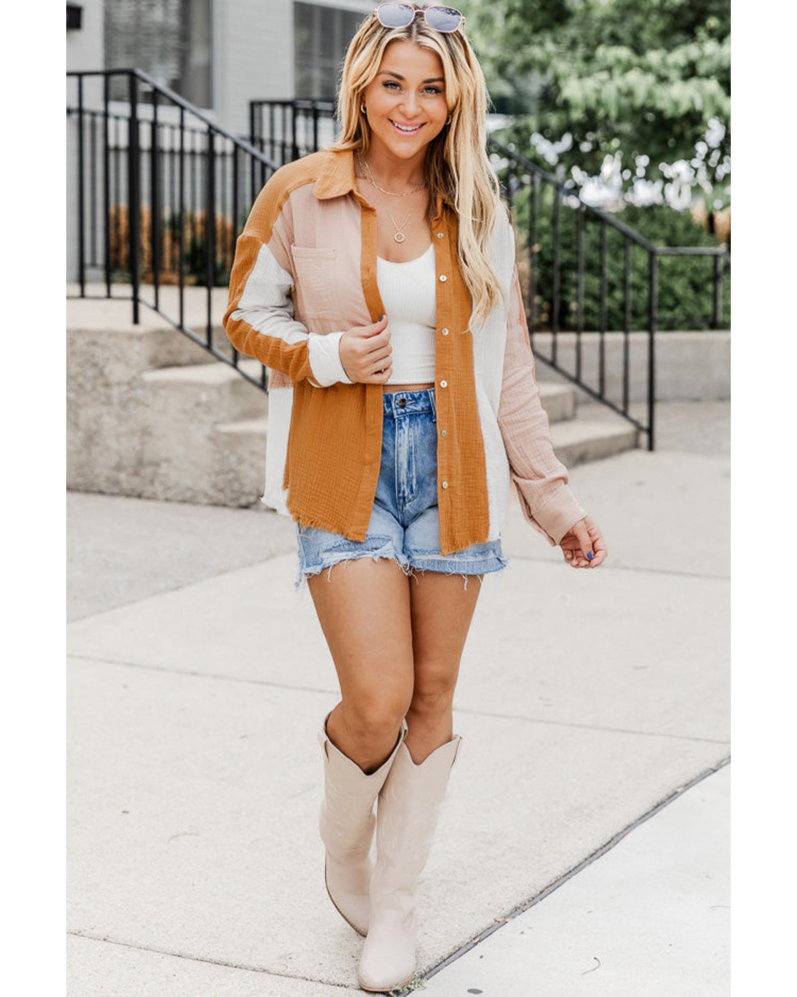 - Grapefruit Orange Color Block Buttoned Raw Hem Textured Shirt
