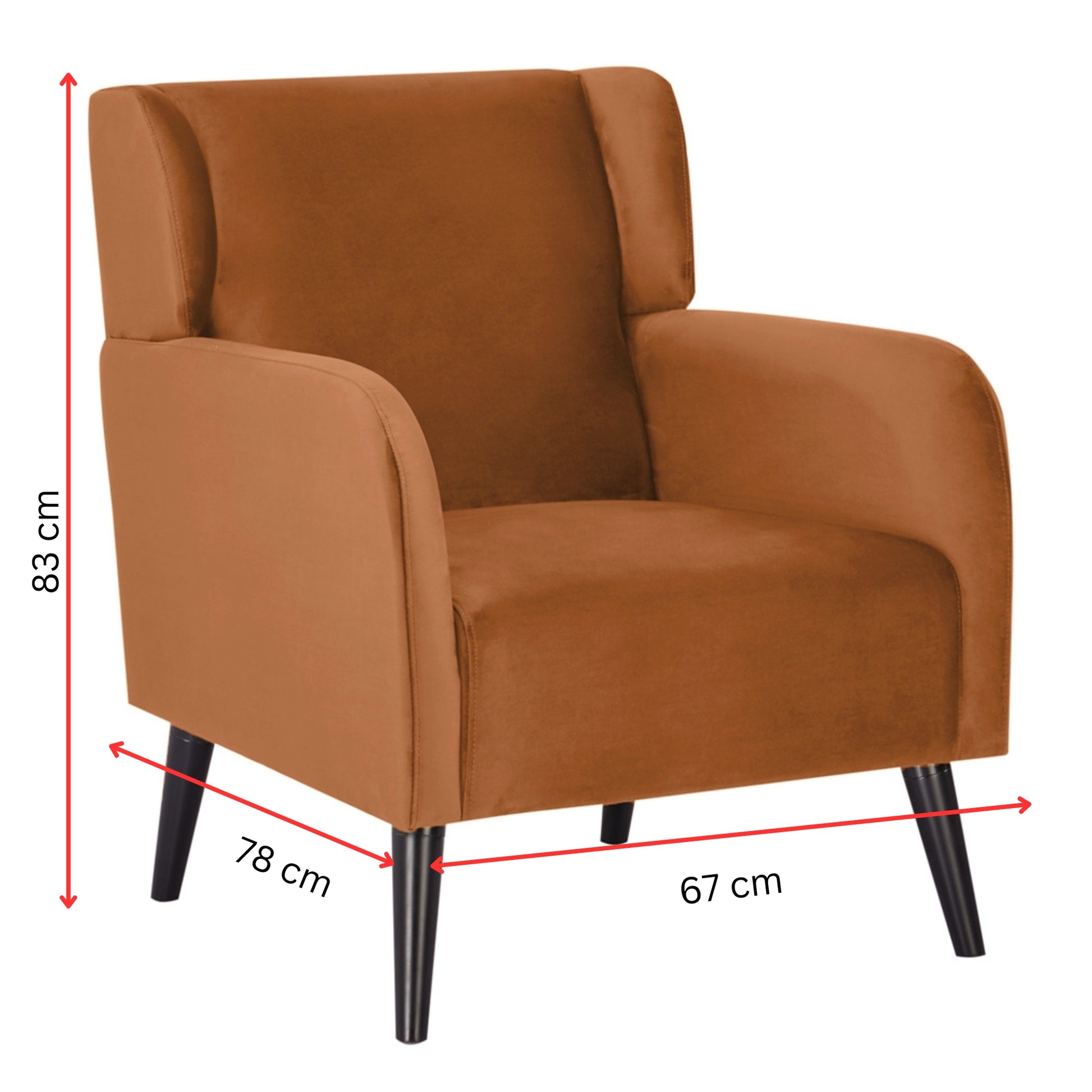 This inviting arm chair in orange has all the qualities to become your private comfort zone. The Scandinavian-style furniture is upholstered in a plush upholstery made of high-performance 100% polyester. The upholstery has a smooth fit due to the intact tailoring on the frame. The solid pine wood and plywood frame make the arm chair light and durable. The long-lasting frame with seating support made of thick bonded foam, fabric, and high-tensile S springs ensures cool comfort when you relax on it. Tapered wooden legs in black give the furniture a super strong base. The arm chair is easy to assemble, and the long-lasting furniture comes with a 1-year warranty.