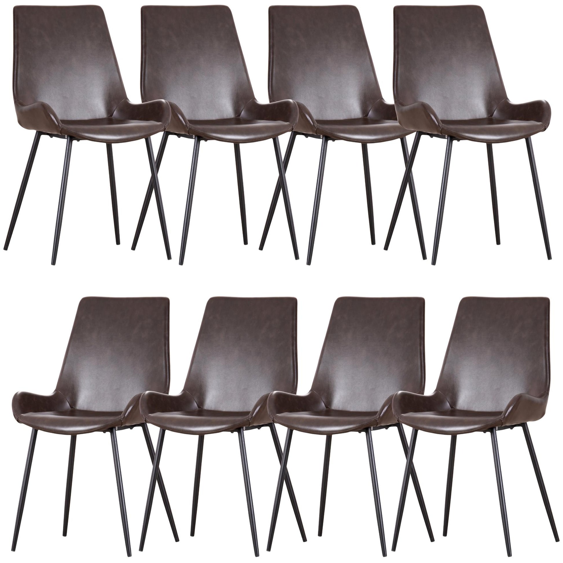Your search for a comfortable and robust dining chair ends here. Bring home this 8-piece set of dining chairs that promise both comfort and strength with their PU leather upholstery and sturdy metal legs. Decorate your dining area with these chairs in vintage dark brown and enjoy the brilliance and beauty of the room setting. The dining chairs are designed in a modern style and provide comfortable back and lumbar support. Because of their gorgeous design, tapered legs, and seamless stitching on the upholstery, they are a beautiful addition to your living area. And thanks to their homely shape, they look stunning in all decor settings and can be paired with a dining table of any style. A one-year warranty is included with the fully assembled dining chairs.