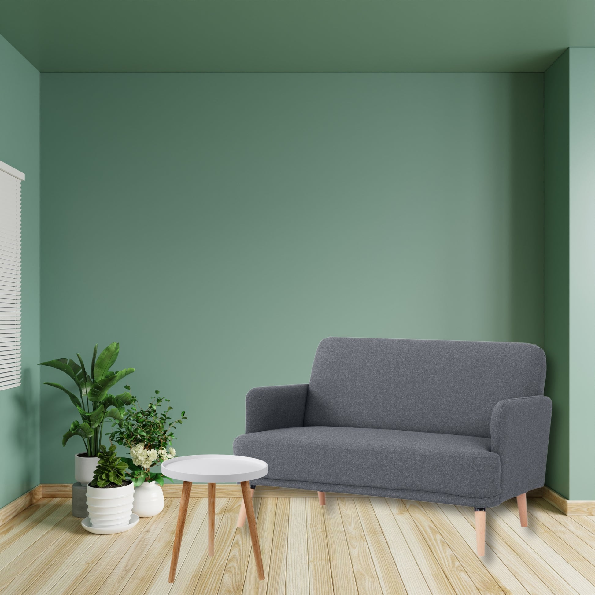 This comfy 2-seater sofa in dark grey is a visual feast in itself. The Scandinavian-style furniture is upholstered in a plush upholstery made of high-performance 100% polyester. The upholstery has a smooth fit due to the intact tailoring on the frame. The solid pine wood and plywood frame make the sofa light and highly durable. The durable frame with seating support made of thick bonded foam, fabric, and high-tensile S springs ensures heavenly comfort when you relax on it. Tapered wooden legs in nature wood colour give the furniture a strong base. The sofa is easy to assemble, long-lasting, and comes with a 1-year warranty.