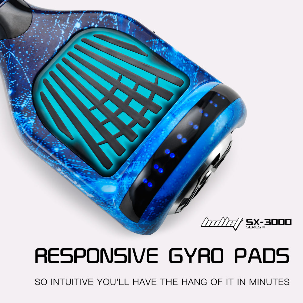 The NEW Bullet SX-3000 Series III Electric Hoverboard Scooter brings a whole new concept of travel to the streets. This state-of-the-art self-balancing device reacts instinctively to your body's shifting movements for highly responsive acceleration, turning and reversing.