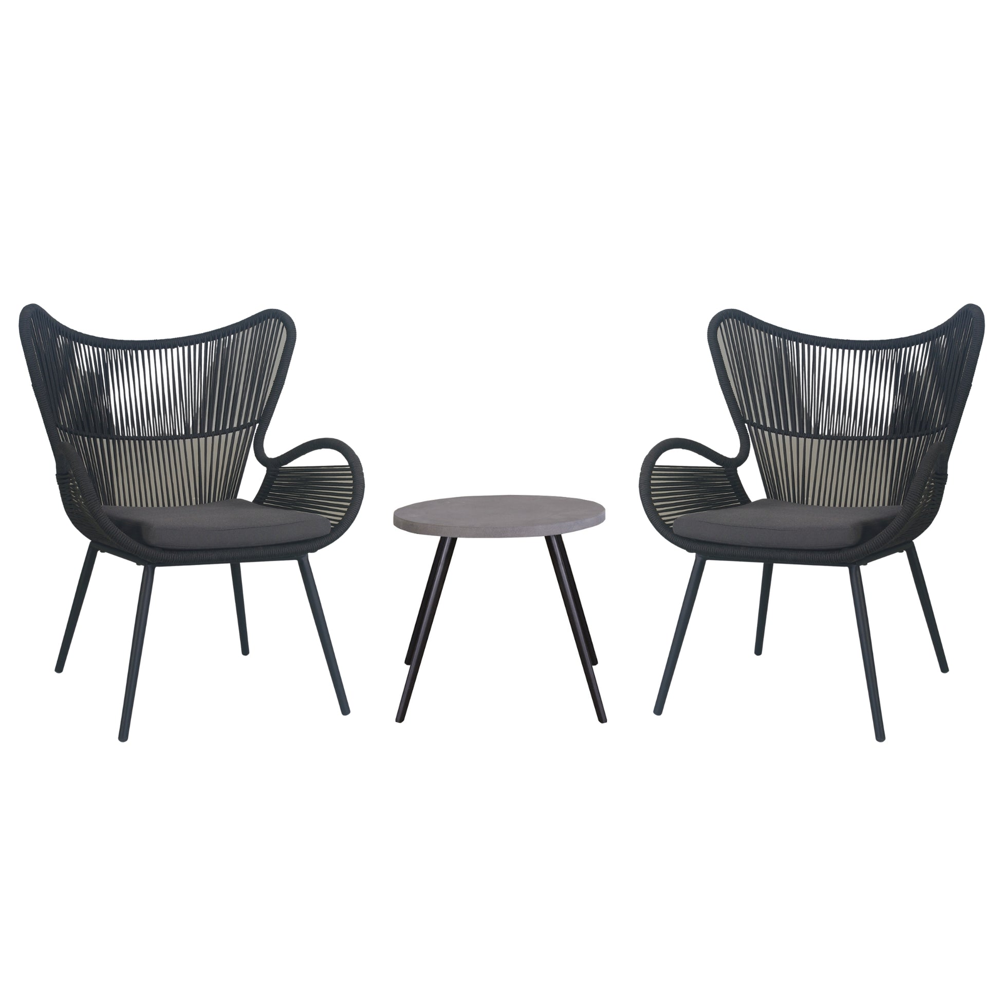 This beautiful armchair set is designed especially for outdoor spaces. Crafted in a classic Scandinavian style, the set consists of 2pcs armchairs and a round coffee table. The set material is weather-proof, water-repellent, and stain resistant. The coffee table has polycement tabletop in dark grey and steel leg in Sandblack colour. Non-porous tabletop treated to resist staining. The structure frame of the armchair is made of steel ED coating before powder coating and weather-resistant polyester rope in black. Grey cushions add beauty to the armchair. The chair is upholstered in polyester fabric. The easy-to-assemble set is highly durable. It comes with a 1-year warranty. The set is suitable for small to medium outdoor areas with minimum area requirements of 207cm x 79 cm.