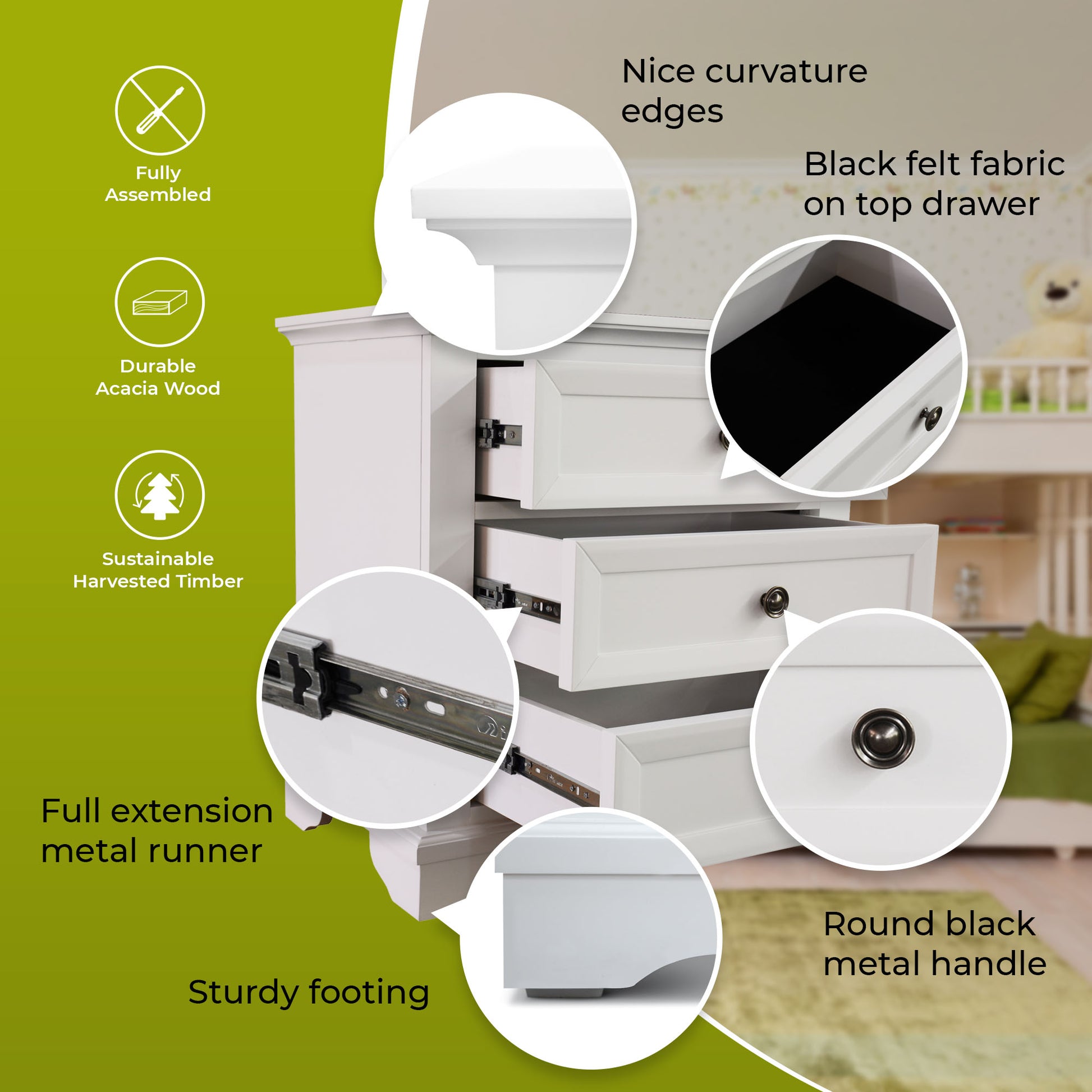 Stop wasting time worrying about where to keep that diary that you need in your bedroom on a regular basis. Bring home this 3-drawer bedside table and solve your bedroom's storage space problem forever. The bedside, designed in a coastal style, is an excellent addition to your bedroom. Its drawers have full metal extension runners and shiny, black metal knobs. The top drawer has black felt for the safe storage of delicate items. The bedside table is made of sustainably harvested solid acacia timber. The wood is known for its good looks, shock-resistance, and durability. The furniture piece in a white painted finish goes well with a variety of interior decor styles, and a one-year warranty is included with the fully-assembled bedside.