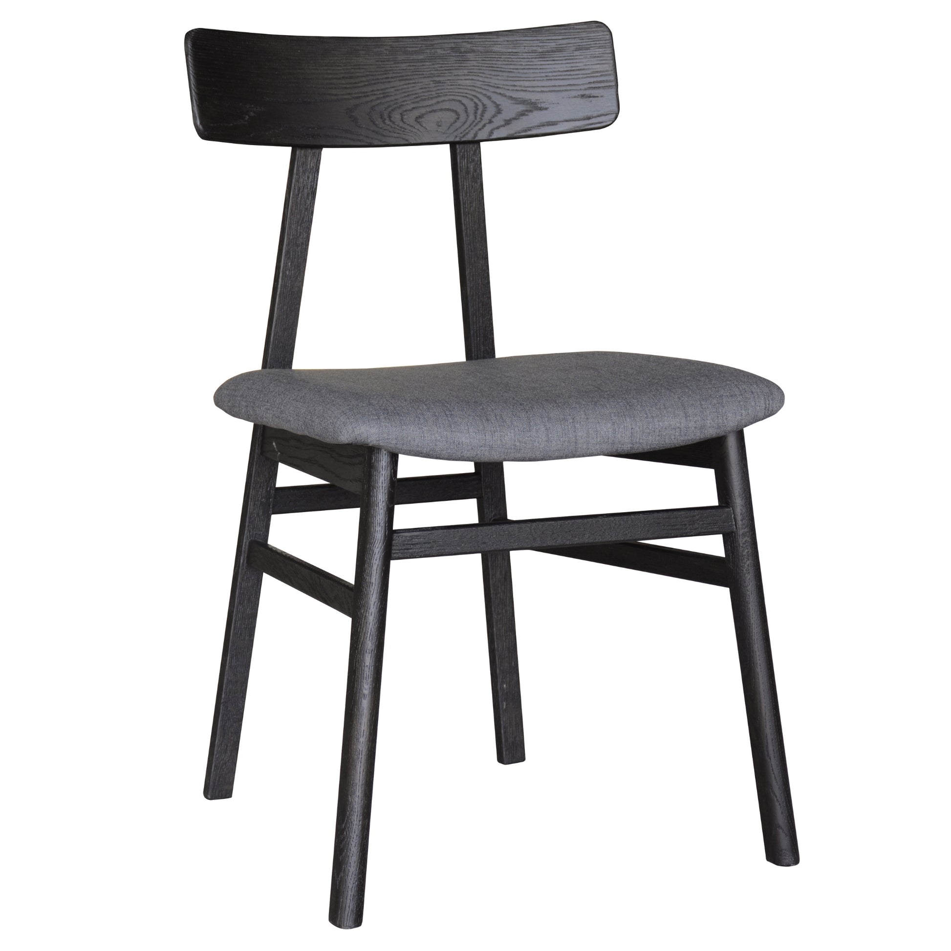 This lovely dining chair with fabric seat fills your dining space with comfort and sophistication. It is designed in the Industrial style. It stands out in any decor setting due to its 100% polyester fabric seat in black and unique back design. The chair frame, including legs, are made of sustainably harvested solid oak wood, with a sandblasted finish in classic black colour. The wood gives the chair strength and durability. The chair has a one-of-a-kind appearance, with beautifully designed legs. The fully assembled dining chair comes with a one-year warranty.