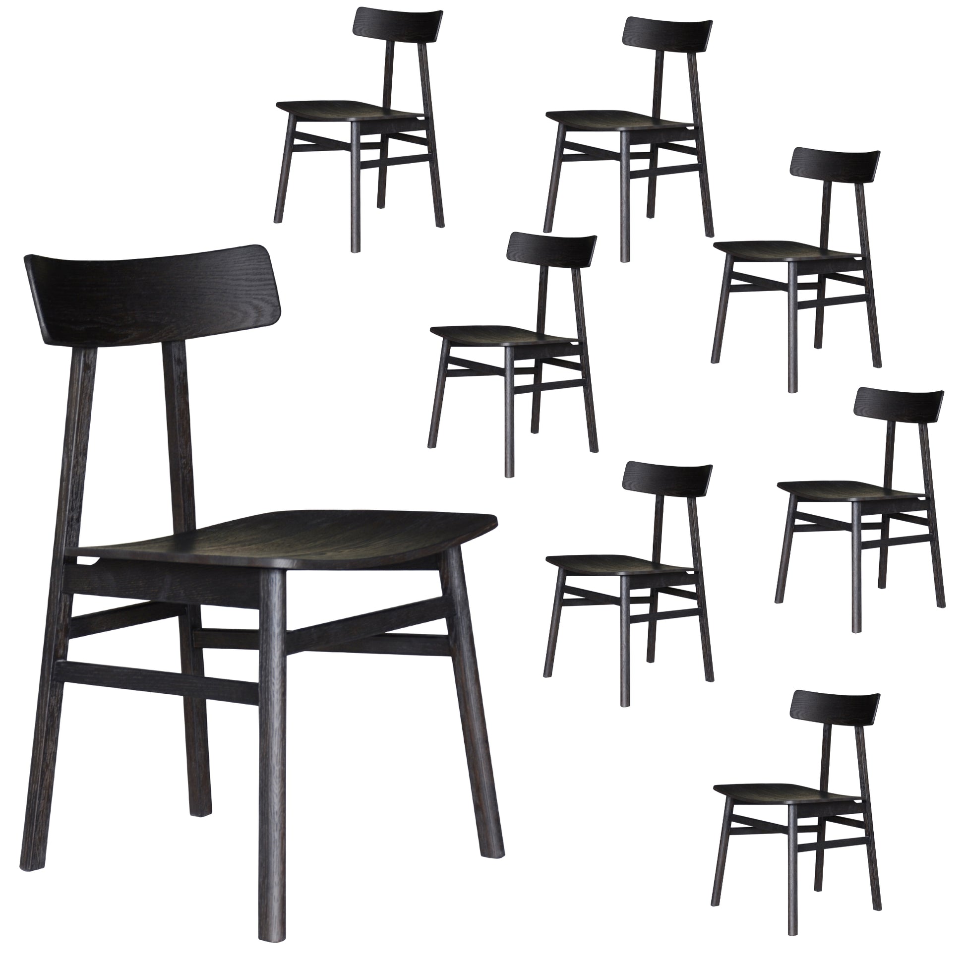 This lovely 8-piece dining chair set with timber seat fills your dining space with comfort and sophistication. It is designed in the Industrial style. It stands out in any decor setting due to its wooden construction and unique back design. The chairs are made of sustainably harvested solid oak wood, with a sandblasted finish in classic black colour. The wood gives the chairs strength and durability. The chairs have a one-of-a-kind appearance, with beautifully designed legs. The fully assembled dining chairs come with a one-year warranty.