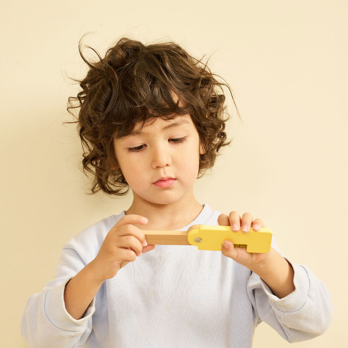A tool belt which contains carpentry tools and accessories, such as a foldable level ruler, screwdriver, hammer, wrench, and screws etc. Children can tie it around their waist so they have all their tools to hand. They will learn how to screw and nail, and develop fine motor skills through creative play.