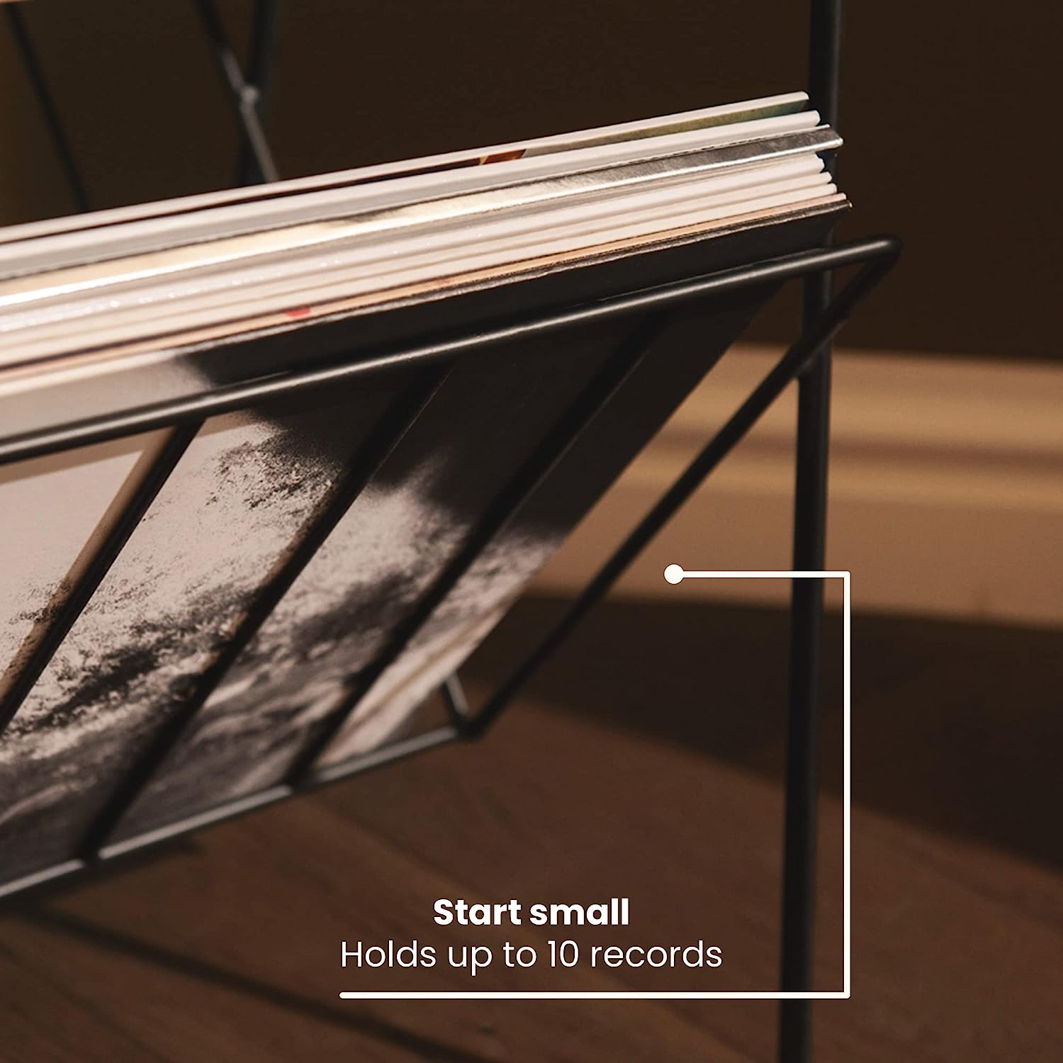 The creative design of the black wire base allows you to flip through up to 10 records with ease and see the full cover art, not just the tiny print on the spine.