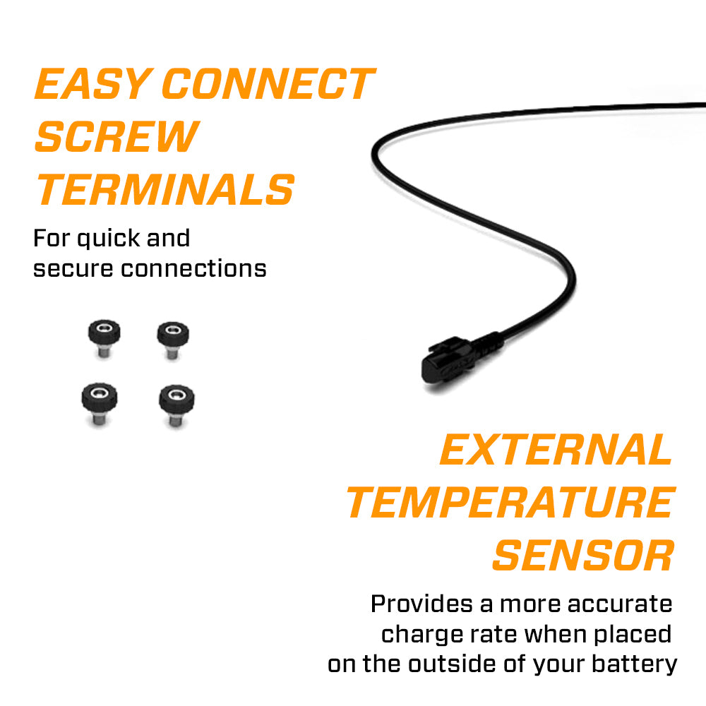 When the service battery is fully charged, the D250SE battery charger will automatically redirect maintenance charge power to the starter battery. The D250SE can maintain a stable output up to 20A to vehicles fitted with smart ECU controlled alternators and also has a temperature sensor for optimised charging, regardless of weather conditions.