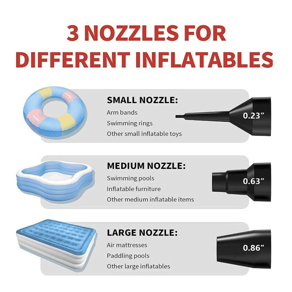 3 DIFFERENT NOZZLES - The electric air pump has 3 universal nozzles( small, medium, and large), Allow you to inflate and deflate air mattress, sofa, inflatable rafts, airbeds, boat, pool toys, swimming rings, inflatable doll, vacuum compression bag, etc, making both setup and storage of your items easy and efficient. But these are designed to work with needle valves nor stem valves, like basketball and tires etc