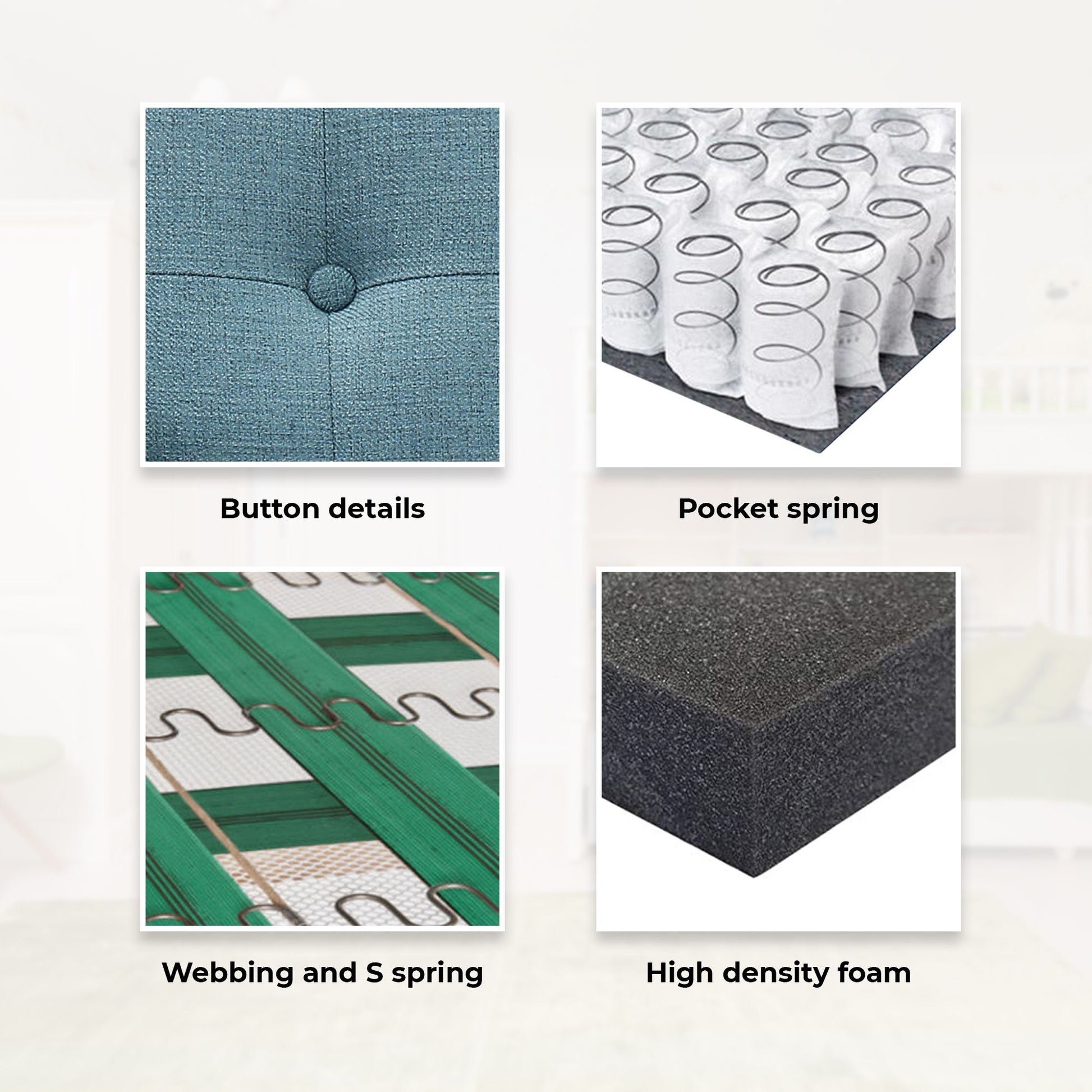 A sofa is the focal point of a living room. Place this beautiful 2-piece set of sofas, designed in the Scandinavian style, in your living room and it will instantly become the most stylish part of your home. The single-seater sofa set is an epitome of superb craftsmanship. They showcase comfy looks, featuring tapered legs and outwardly sloping arms. They have a fixed backrest with button details and loose-style seat cushions with high-density foam for superior comfort. The armchairs in blue mix easily with any interior decor style. The entire sofa is upholstered in 100% polyester fabric, which is soft and durable. The stunning sofas also feature high-density foam, webbing, pocket springs, and S-springs that ensure complete relaxation for the body. The structural frame of the sofa is made of sustainably harvested solid wood and plywood, which gives it internal strength and resilience. The frame has a five-year warranty; the foam and springs have a three-year warranty; the fabric and stitching have a one-year warranty; and all other parts have a one-year warranty.