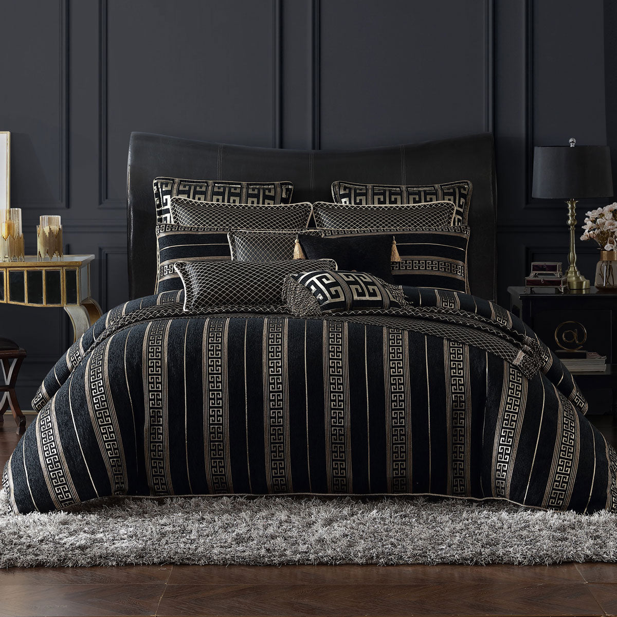 Mateo Gold Yarn-dyed Chenille Jacquard Quilt Cover Set Super King by Davinci brings drama to the bedroom. Bold stripes in black and gold, woven in softly textured chenille, are embellished with the lustre of metallic gold in a Greek key motif. The luxurious design adds an elegant touch to your space, making it a perfect choice for those who appreciate sophisticated style and comfort.