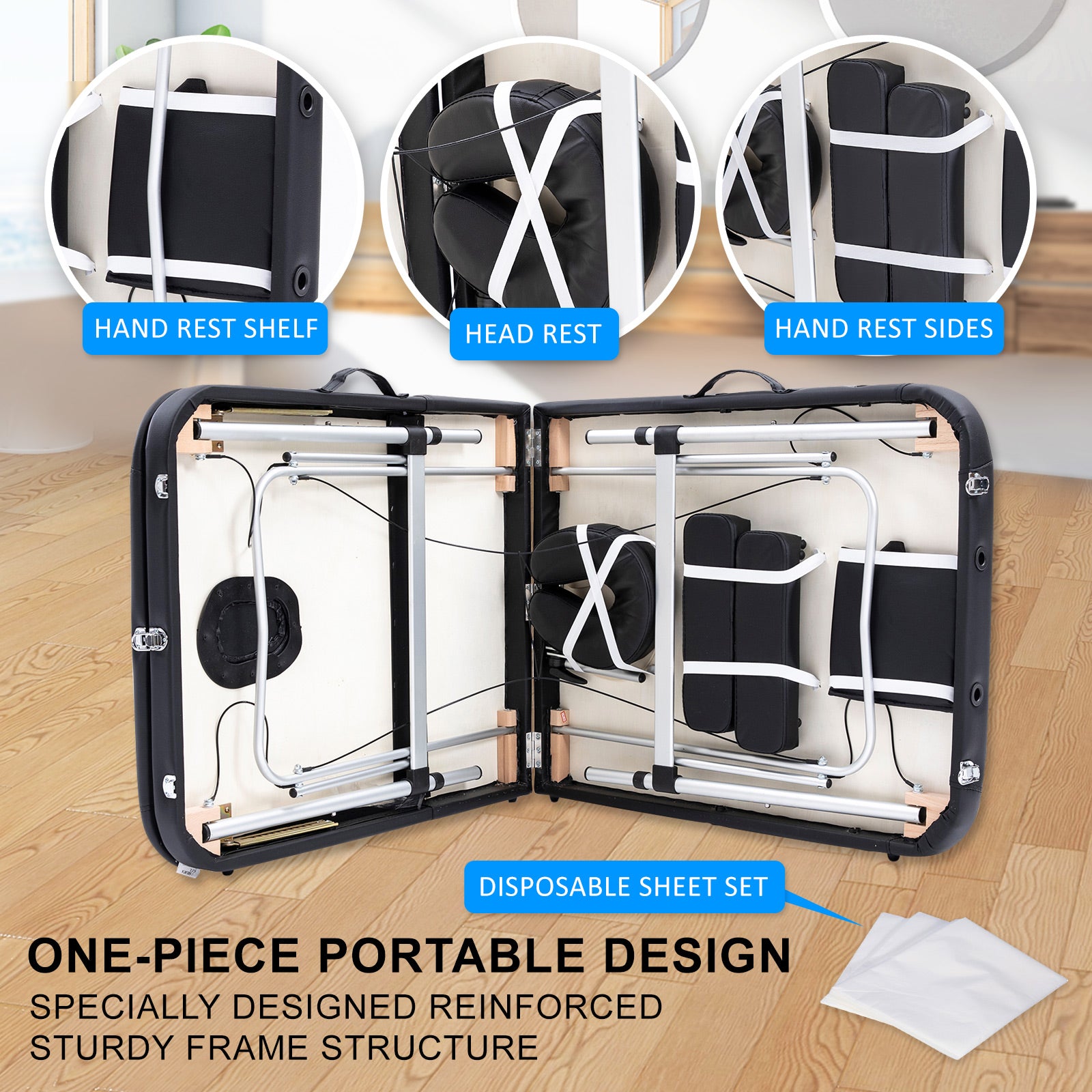 The high-quality massage table 75cm wide 3-fold aluminium comes with a disposable sheet cover set and a black carry bag. This is not only a mere great bargain, but also a portable product with all means of functional components.