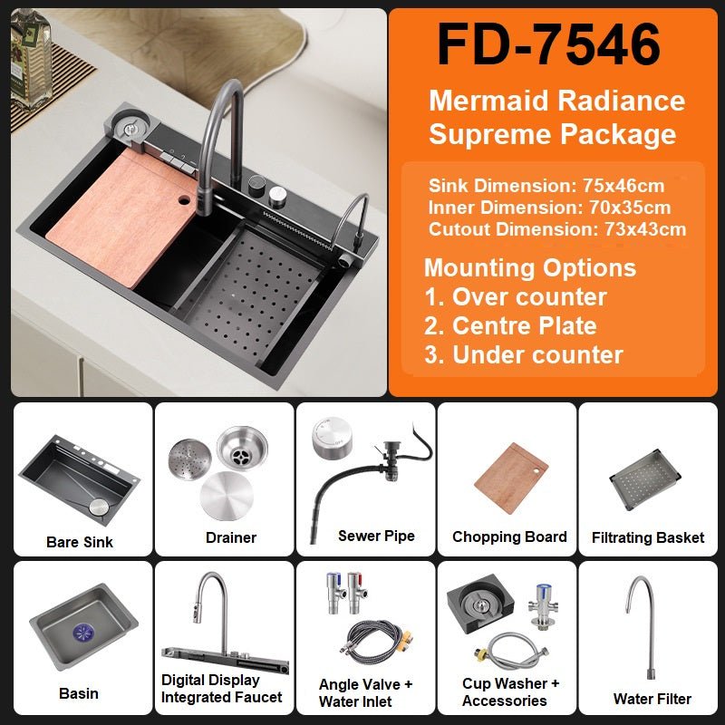 HIGH-QUALITY MATERIAL:This waterfall kitchen sink is newly released to the market. It is made of high-quality 304-grade stainless steel for excellent hardness and durability. The kitchen sinks adopt nano-coating finish, which is anti-rust, durable and long-lasting. Wipe clean for easy maintenance.