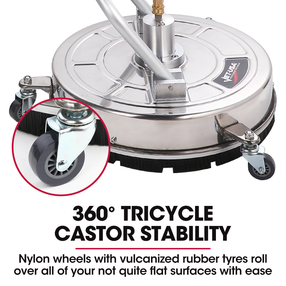 The Jet-USA has a stainless steel body with two nozzles spinning at 2500 RPM mounted on 3 corrosion-resistant castors for consistent coverage. Powered by up to 4000 PSI this heavy-duty cleaning disc delivers the outstanding results you've come to expect from Jet-USA.