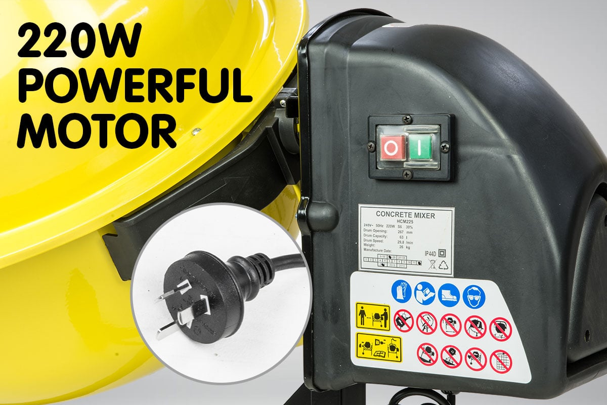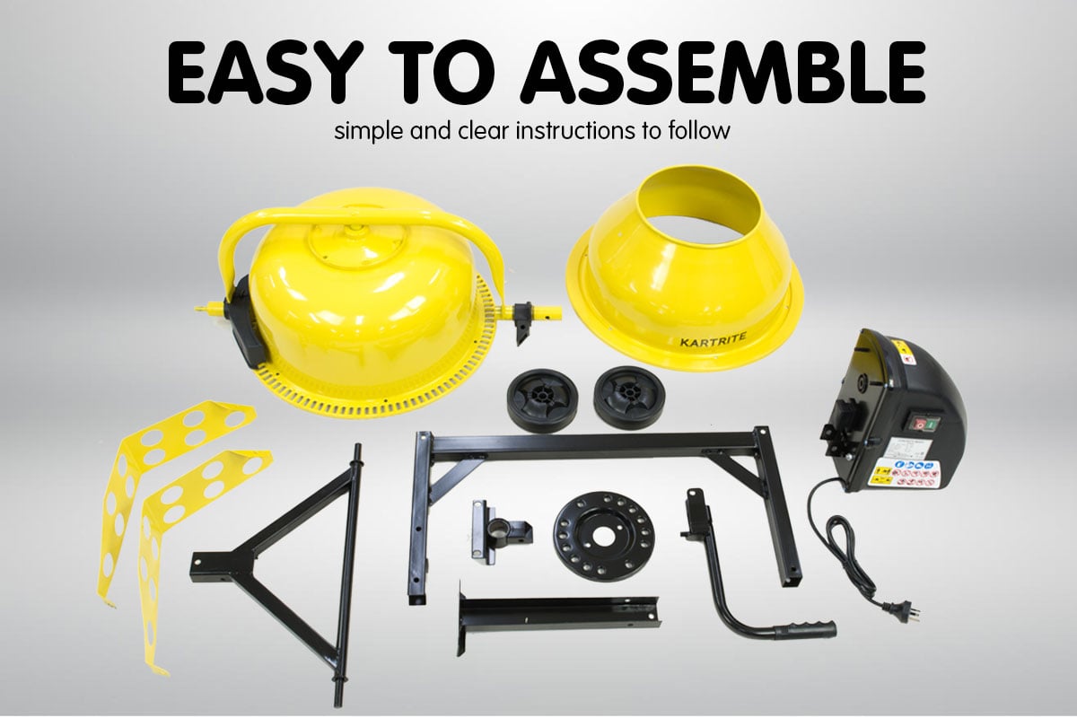 This Kartrite electric cement mixer has a 2.2 cubic ft 63 litre capacity bowl. With a flip of a switch it produces evenly mixed concrete. Equipped with an easy-load heavy duty steel drum, this mixer is also ideal of mixing sand and gravel. It has two 5.5 inch rubber wheels, easy to control. which provide convenience for moving the machine around the job site.