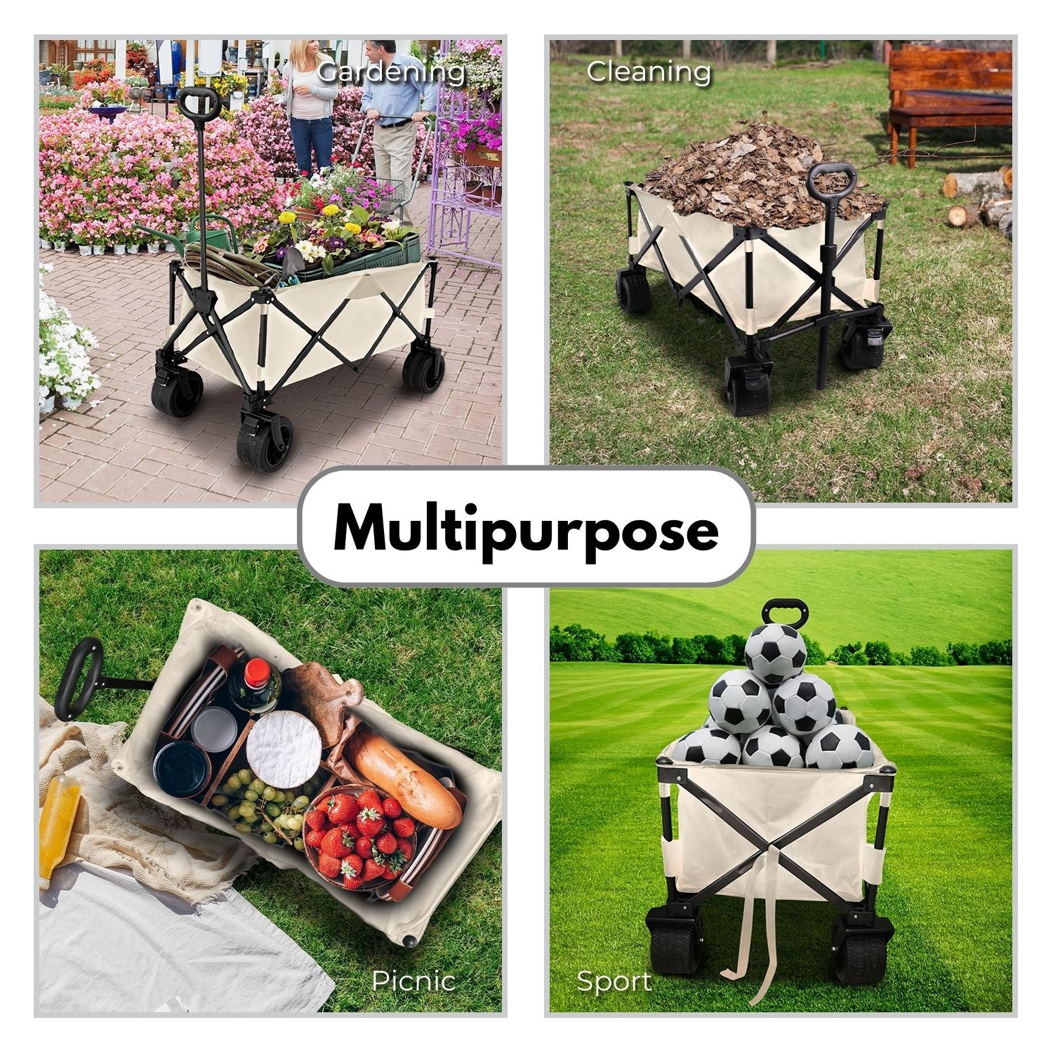 Foldable Design for Convenient Transport: The Wagon Trolley Cart features a foldable design, providing unmatched convenience when it comes to transport and storage. When not in use, simply fold the cart to a compact size for easy storage in your vehicle, closet, or garage. This foldable feature adds versatility and portability to the cart's functionality.