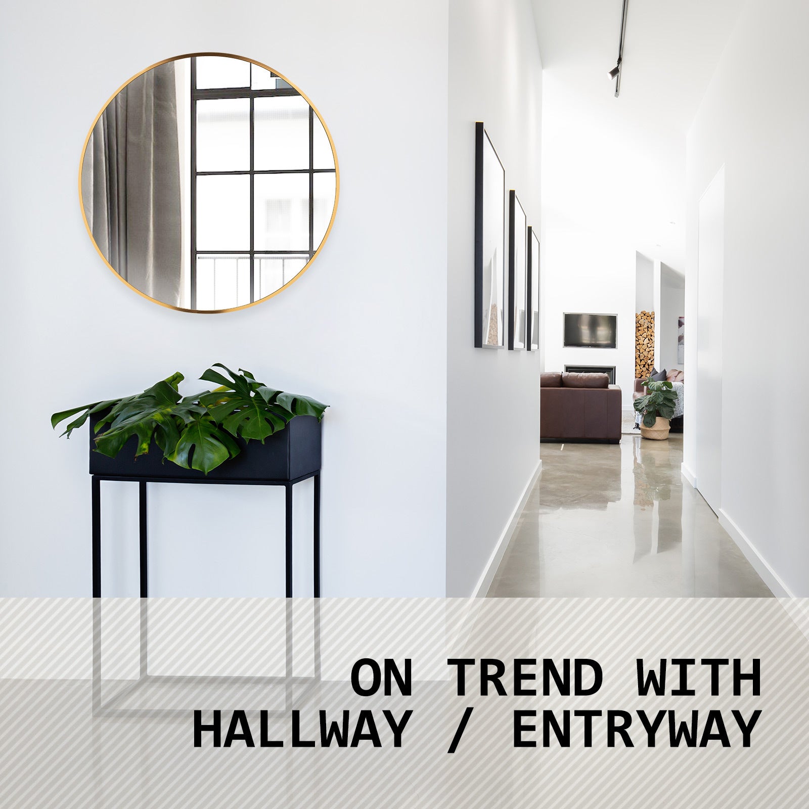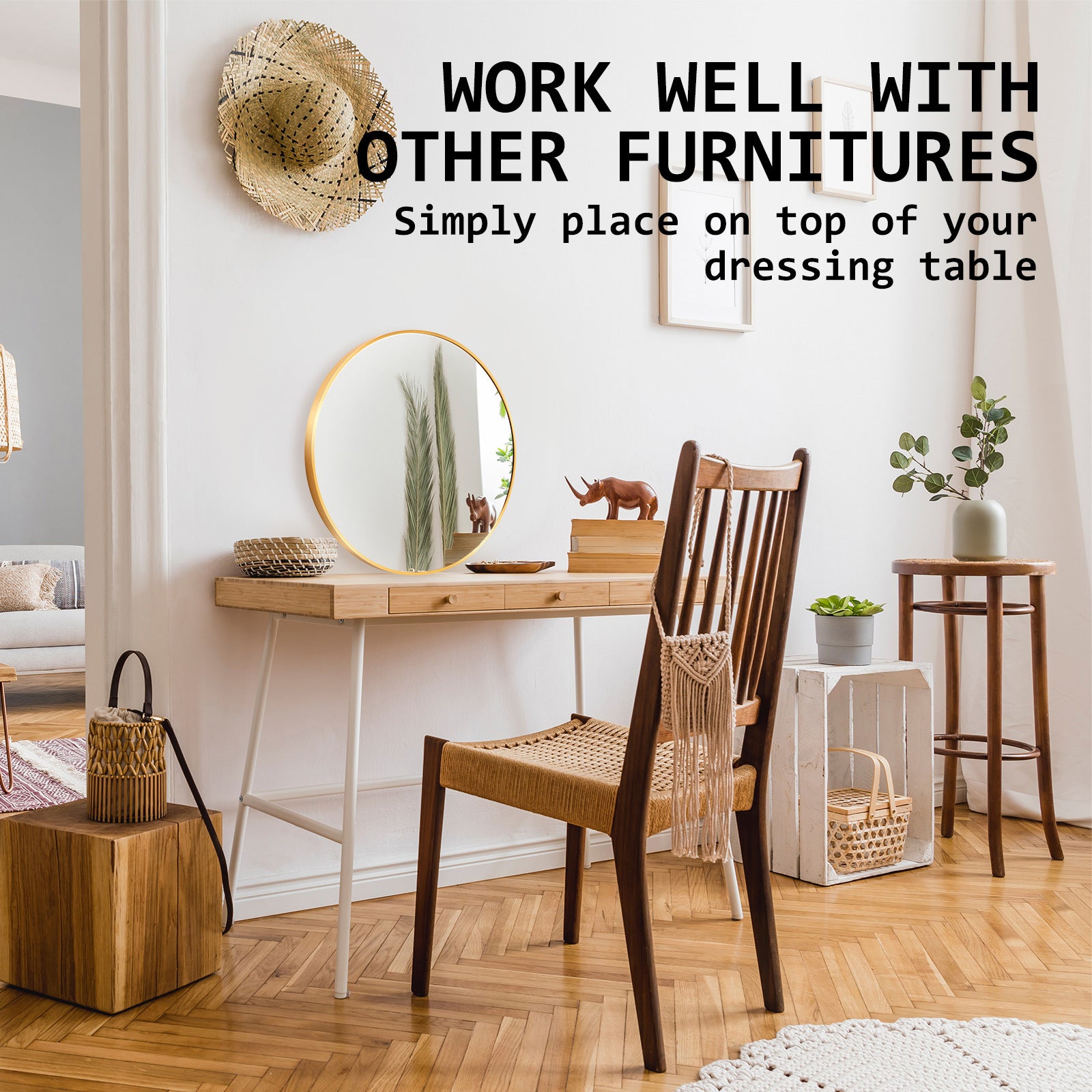 The round mirror is modern and clean in design and comes with a 3.9cm thickness minimalistic aluminum frame that is sure to capture the attention of all. Plus, its curved lines all around will become a central focal point in any room which makes spaces feel more inviting and relaxing.