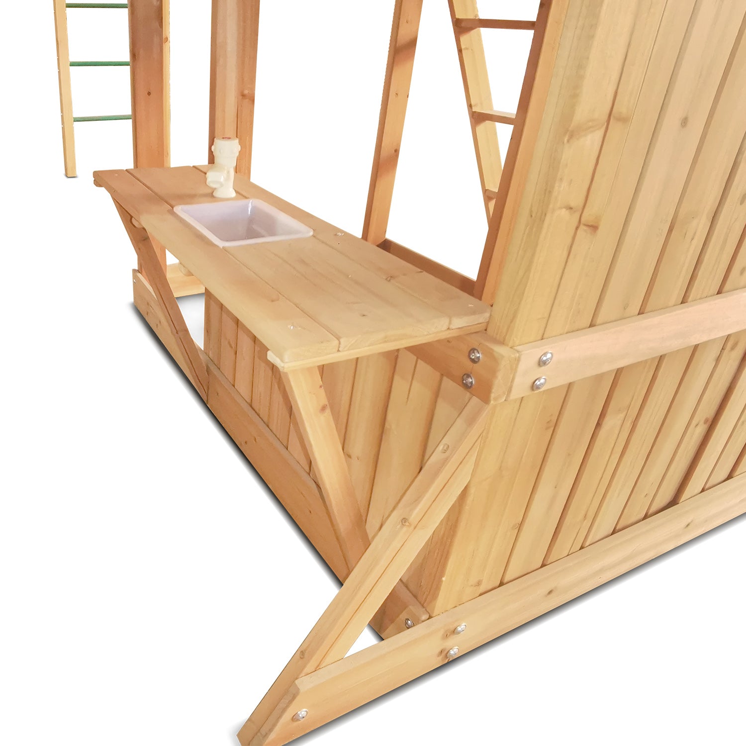 Keep your kids moving and their imagination flowing with the LSK Coburg Lake Play Centre. The fort's upper-level allows your kids to be the Kings and or Queens of their kingdom, while the mounted telescope allows them to keep an eye on their followers below. Down the slide, you will find an imaginative Cafe, take orders, set up your menu on the chalkboard, and serve your customers at the snack window. When all your customers are satisfied, wash up in the integrated and imagination filled play sink. When lunch is over, two belt swings, an Acrobat bar, and a slide will keep everyone moving and entertained for hours at a time.