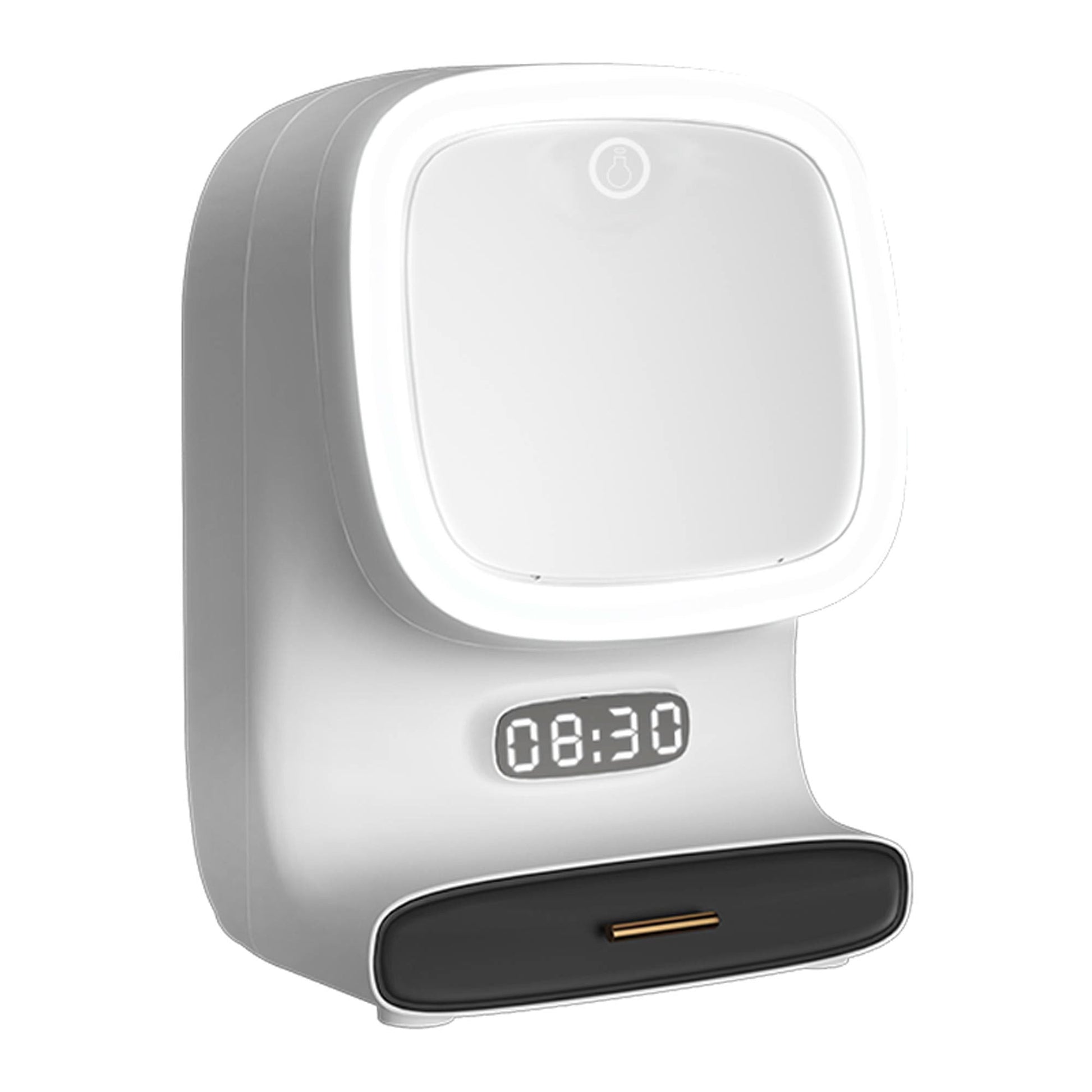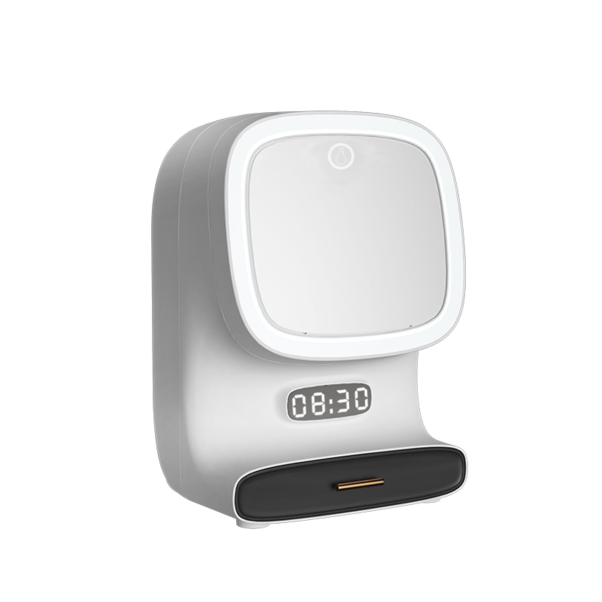 Crafted with sturdy non-toxic ABS plastics, the unit is equipped with a large mirrored face bordered by a USB chargeable ring light with 3 colour options, a bright white, a warmer orange and an off white LED lighting mode.