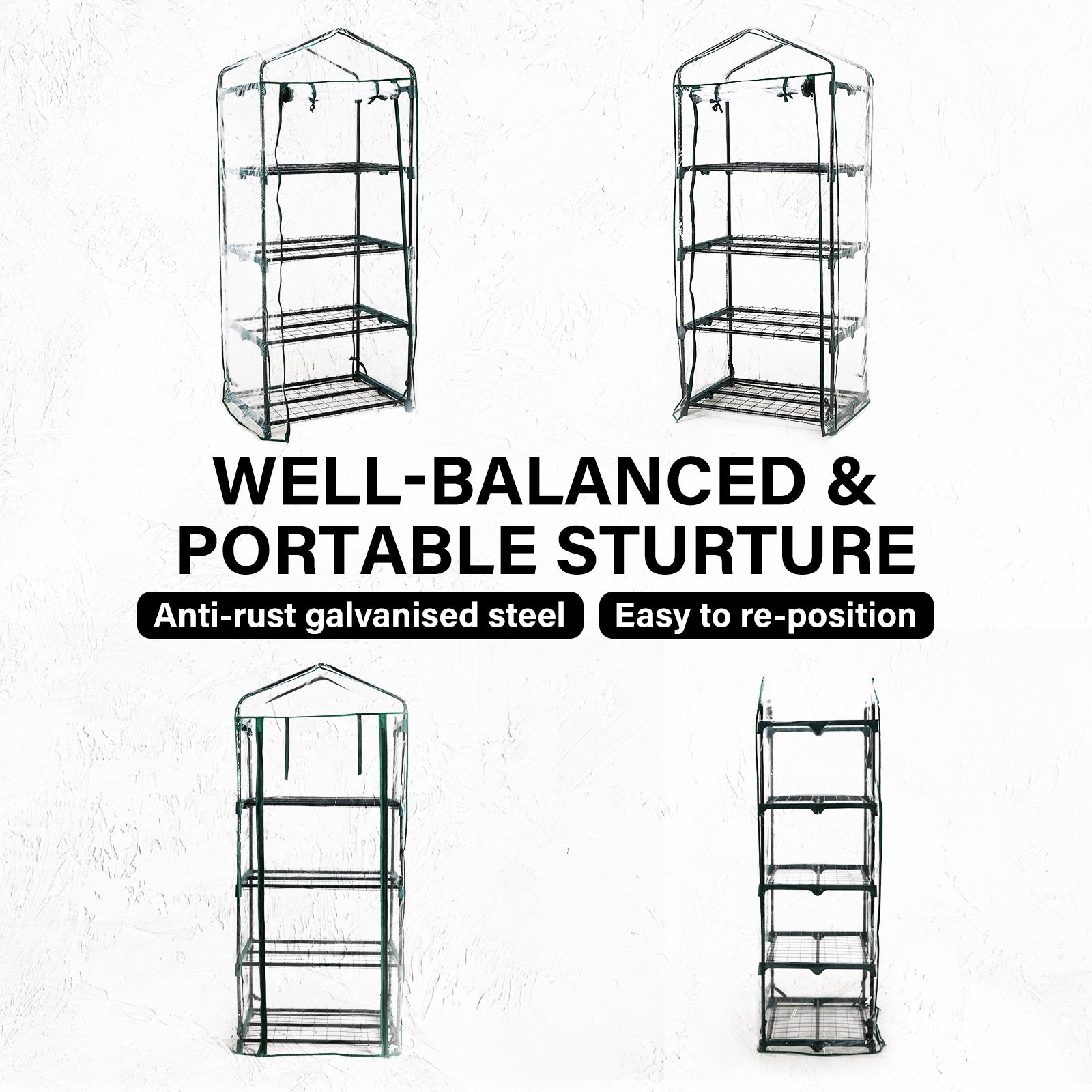The frame is light and strong with powder-coated paint and this will help keep it from rusting due to weather exposure. The high-quality plastic joints are UV treated and they will be able to cope with Australia's strong sunlight without cracking or bending. The cover is removable and made of high-quality UV-resistant ultra-clear PVC which maximizes the light inside the greenhouse. It comes with an easy-roll up door with dual zippers so you can plate or remove, as well as work on your plants with ease.
