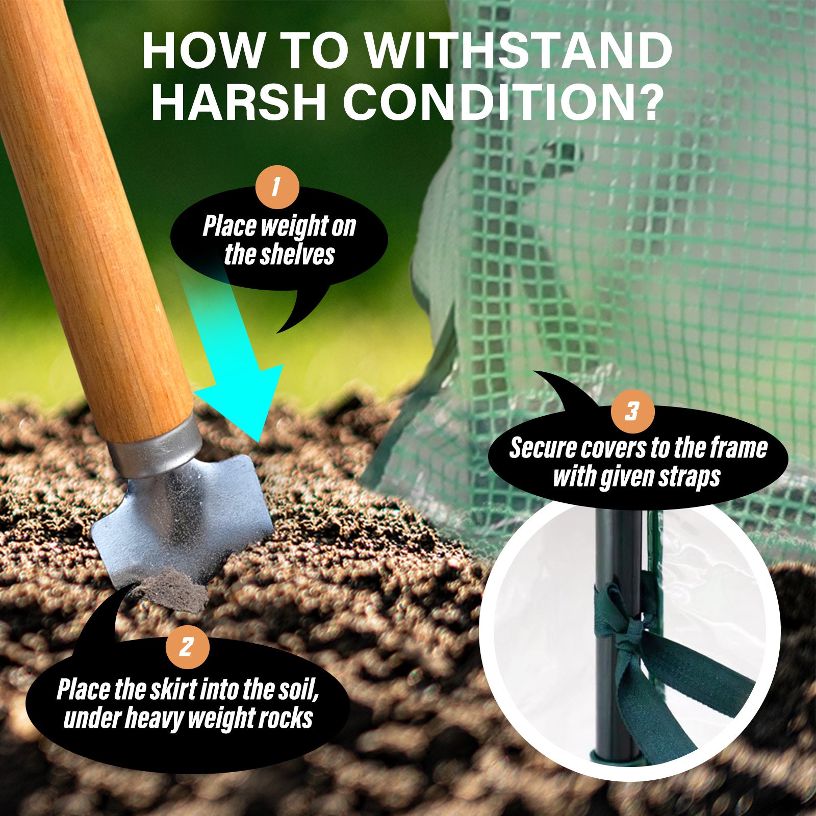 *Please note that this greenhouse certainly needs weights in order to be able to withstand strong winds (Pegs included but weights not included in this package). It is ideal to place your greenhouse in a position that provides afternoon shade, good drainage, and is as sheltered from strong wind/storm.