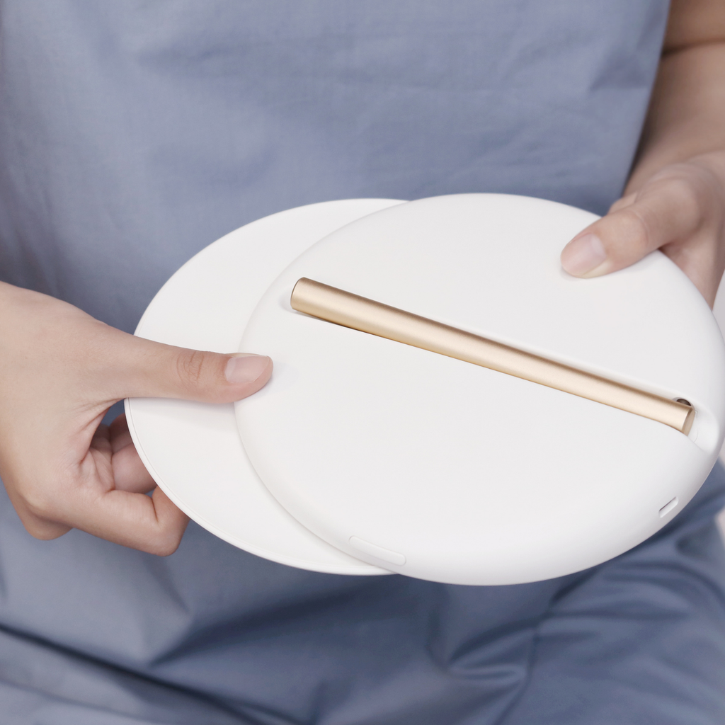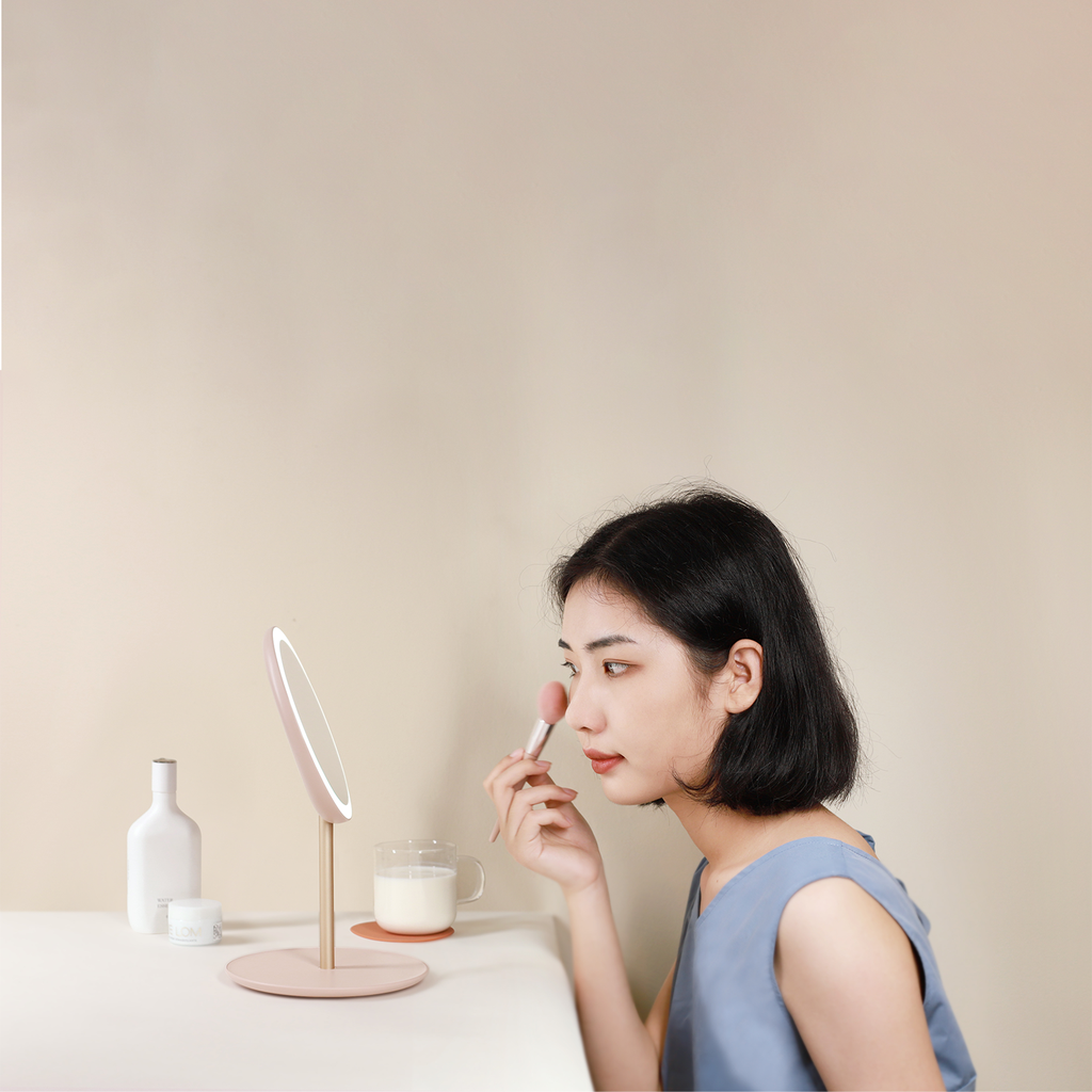 A minimalist beauty mirror integrated with multi-functions such as standing a bedside table lamp and acting as a mirror for makeup.