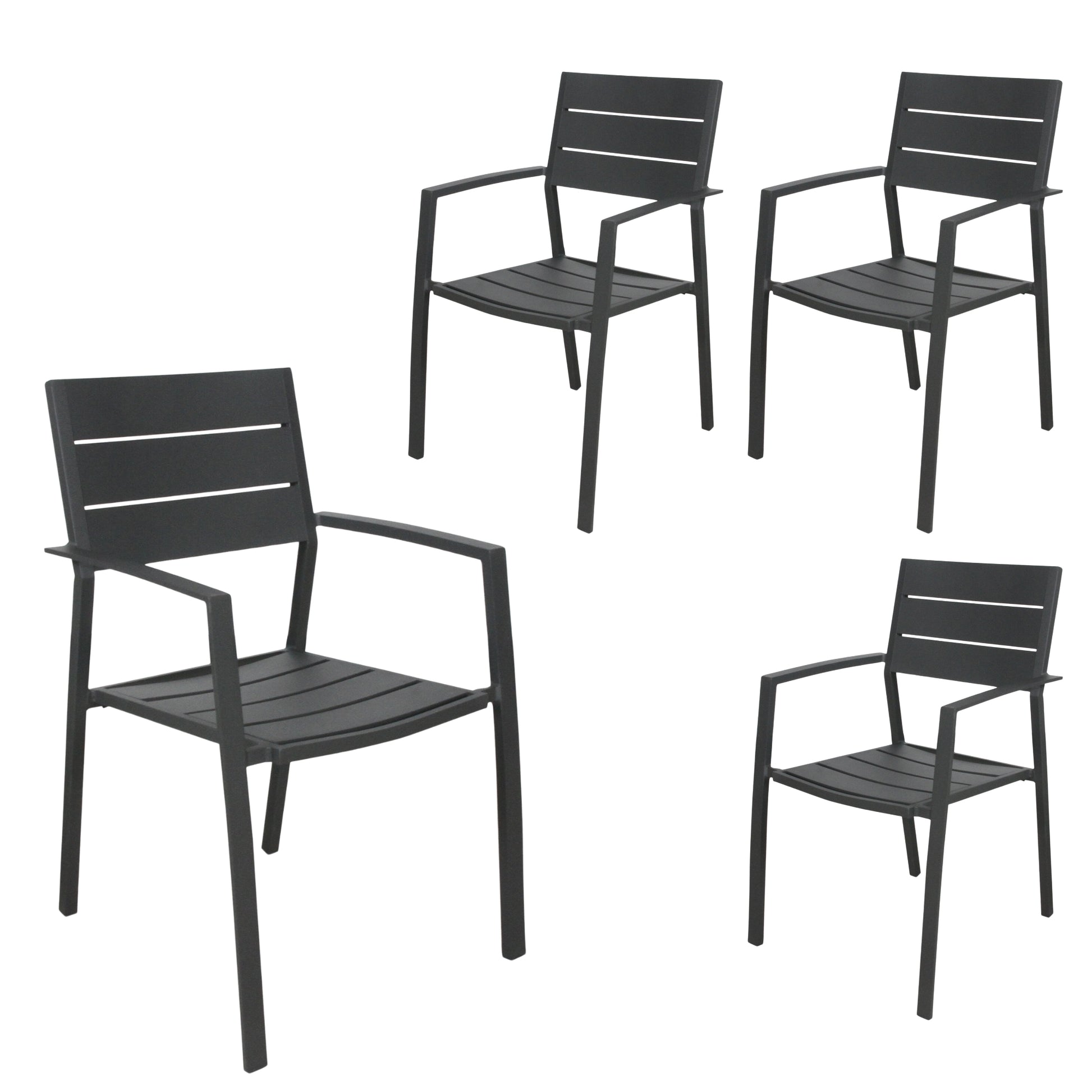Here is a 4-piece set of distinctive dining chairs that look beautiful in outdoor areas. Designed in industrial style, the chairs are sturdy and compact and look nice when paired with an outdoor dining table of any design. The structural frame of the chair is made of non-rusting aluminum. The metal frame provides great durability and strength. The lightweight aluminium frame gives it great portability, and elegantly styled legs give it a good look. The chairs in gunmetal colour are easy to clean and maintain as well. The fully assembled chairs are durable, and their frame comes with a one-year warranty.