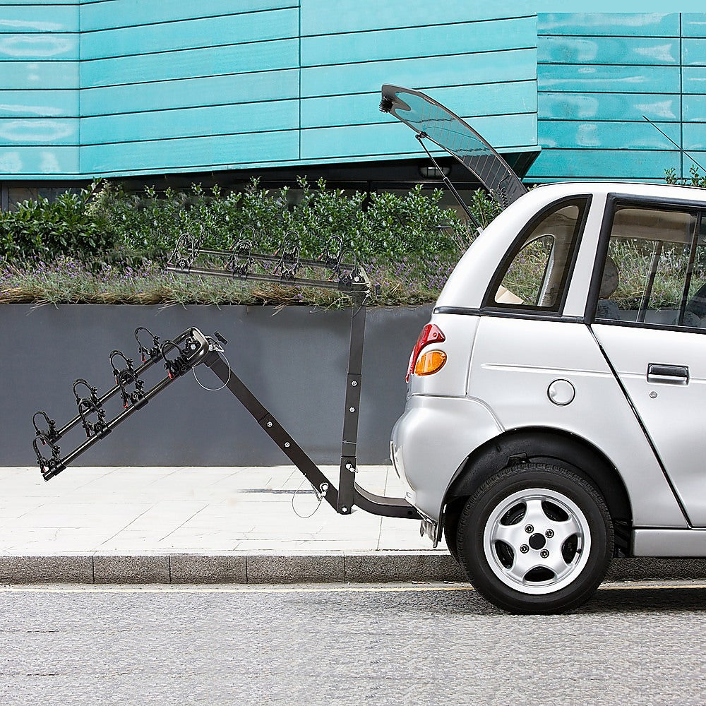 Done in neutral black in a convenient hitch rack design, this rack accents any vehicle's colour scheme. Folding arms make it easy to store after each use. Then, when you're ready to take off again on your next adventure, simply swing the arms up to load your bikes. Even better, the rack tilts down to give you easy access to your vehicle's boot. It's easy to install and even transfer from vehicle to vehicle. Get ready for your next holiday early. Order your four-bike rack today!