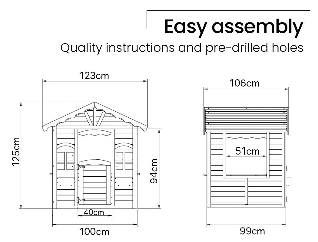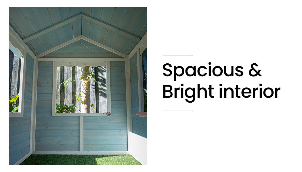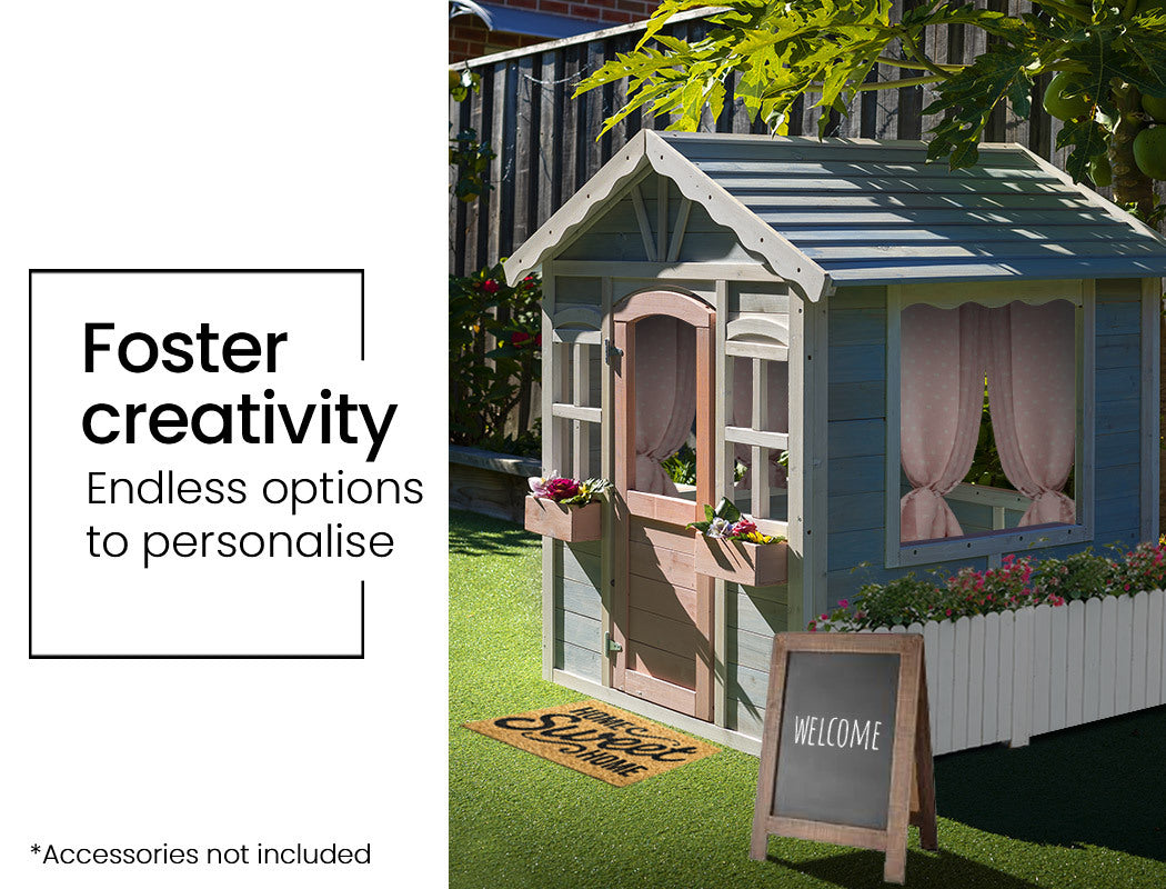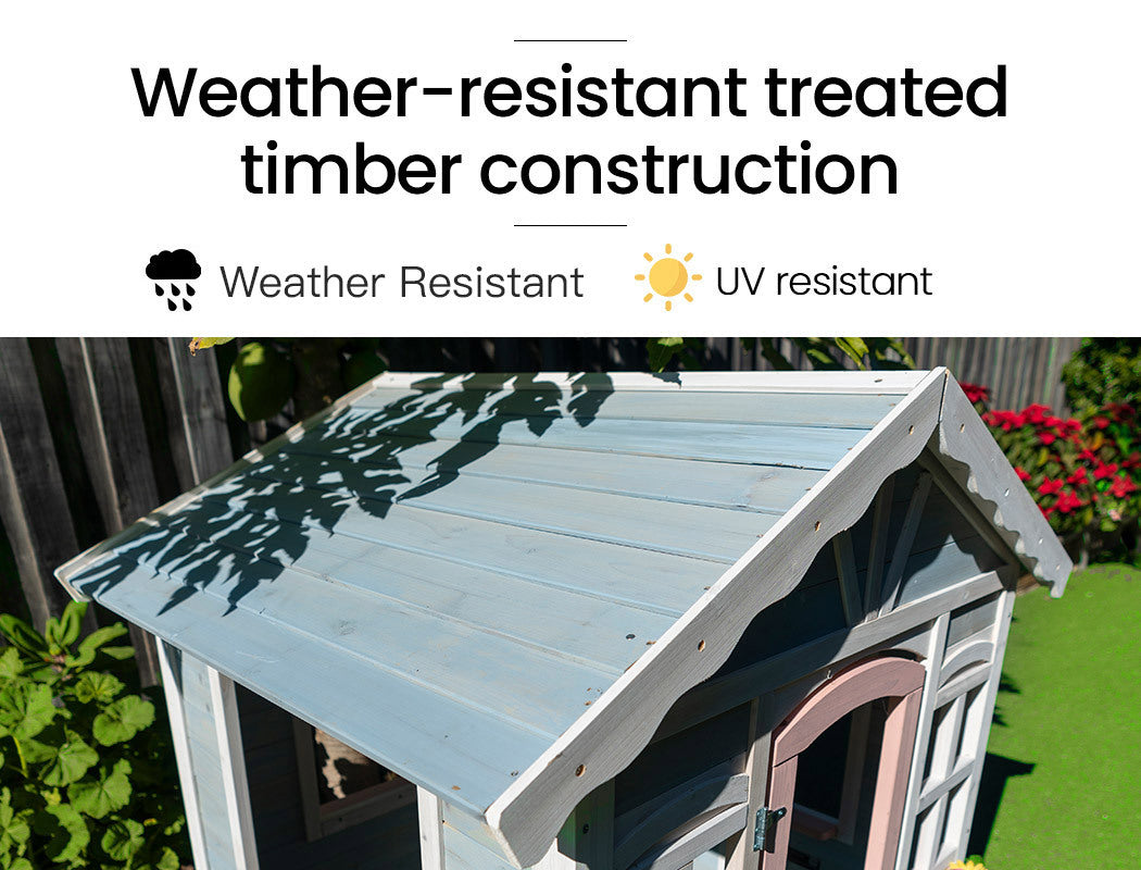 With large windows allowing for plenty of natural light to filter in and an easily accessible front door, you will have a complete view of your child's imaginative cubby house play. Feel at ease knowing Rovo Kids provide round corners around the window sills for added protection during playtime and the cubby house construction is glass-free with non-toxic paint. The weather-resilient roof provides shade during the hot summer days and shelter in the winter.