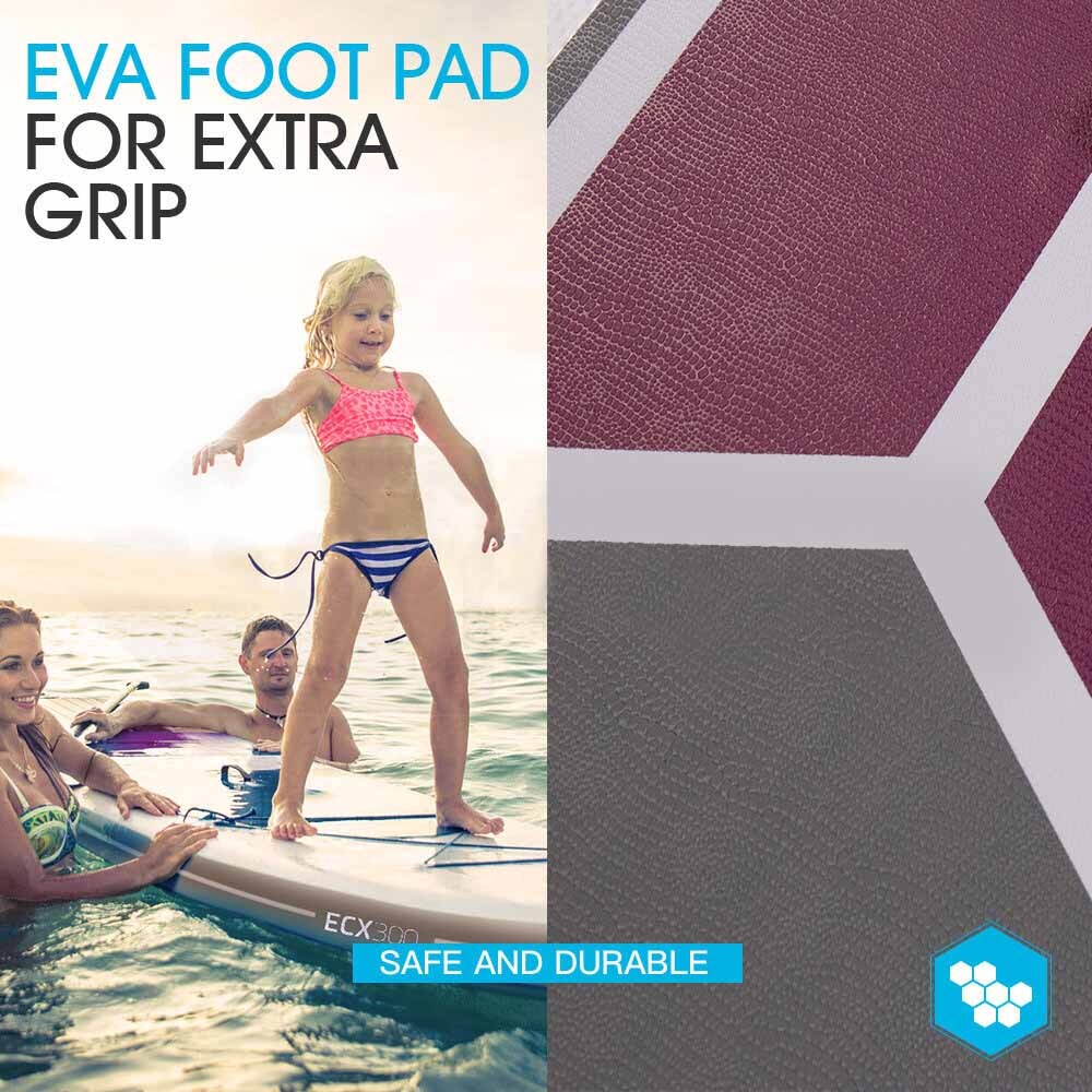 The ECX300 SUP comes complete with all the quality gear you need to hit the water; a telescopic paddle, hand pump with pressure gauge, valve wrench, tether, repair kit and a rugged carry bag. The paddle's telescopic shaft, aluminium body and ABS blade boast supreme rigidity and mobility without compromising weight and durability.