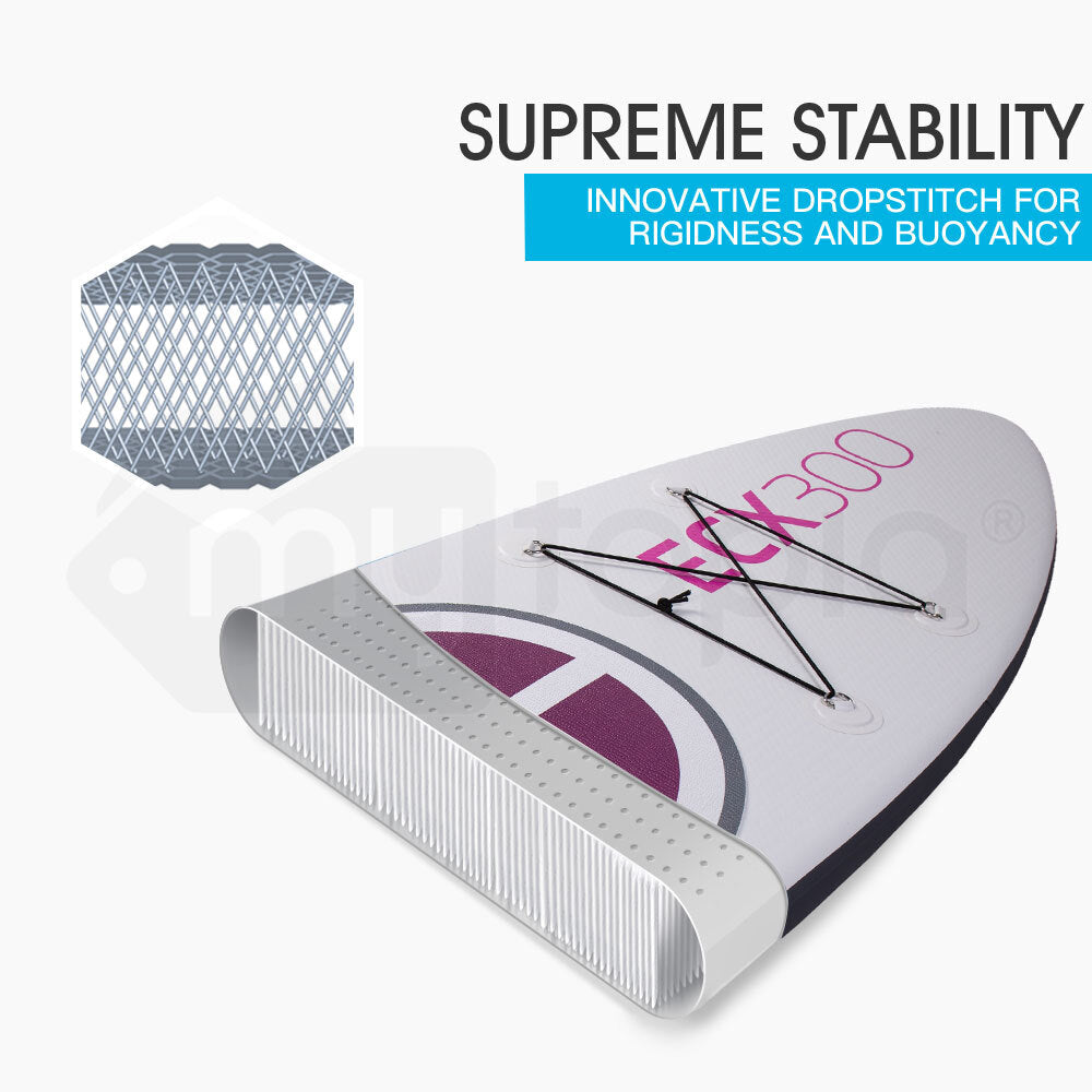 This SUP board is constructed from 10cm thick drop-stitch material which ensures responsive handling, and is so rigid it can support up to 125 kg. You'll enjoy traditional hard-shell performance, along with the convenient transportation and storage of an inflatable.