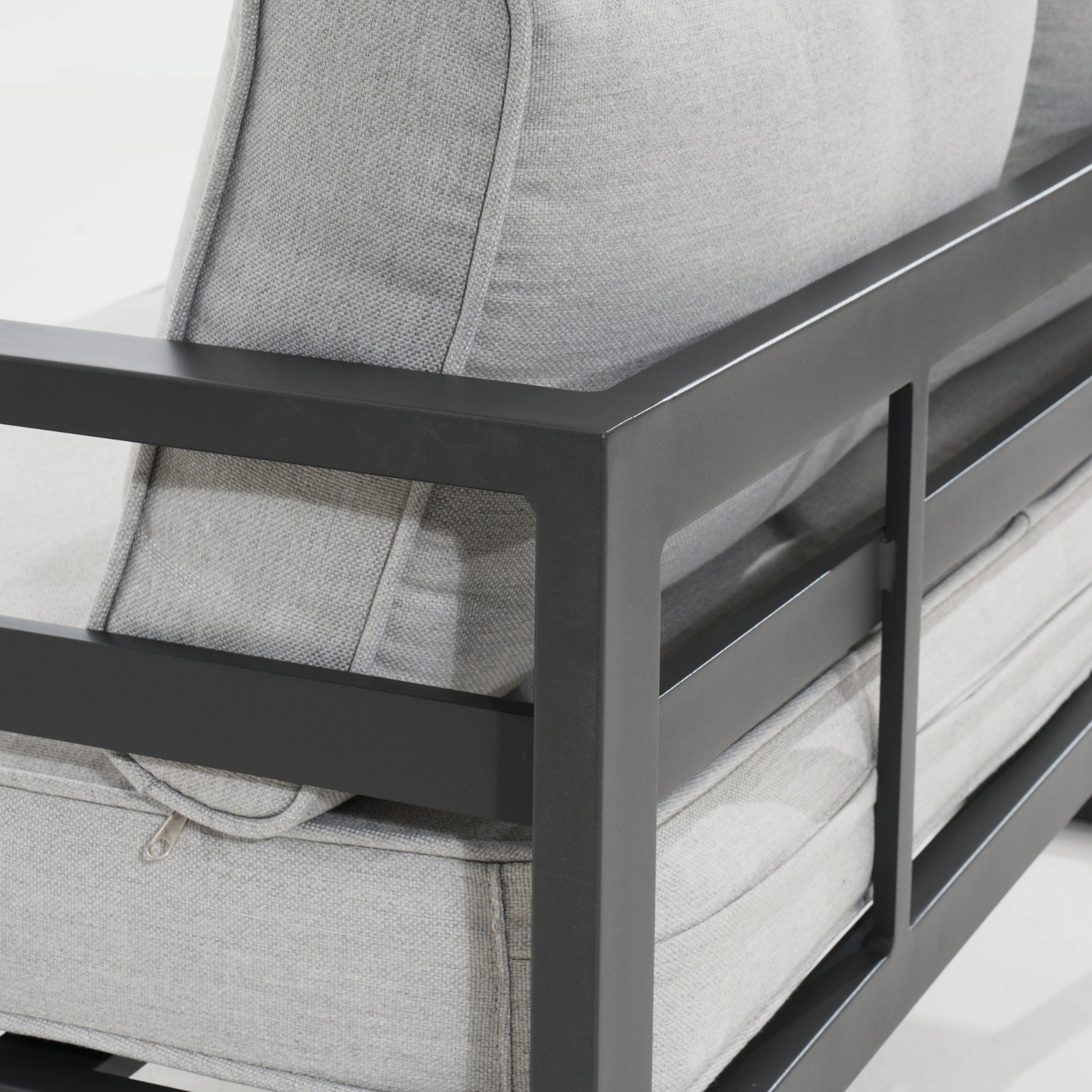 This 5-piece modular lounge set is designed especially for outdoor spaces. The set in charcoal frame and light grey fabric make the outdoor areas useful. The set is designed in an industrial style and consists of left- and right-hand 2-seater sofas, 2pc long ottoman, and 1pc beautiful side table in a slim design. The furniture pieces are upholstered in high-performance 100% polyester fabric. The upholstery has a smooth fit due to the intact tailoring on the precision-cut aluminium frames. The aluminium frames make the furniture pieces light-weight and durable. The sofas feature reversible cushions, and there are Velcro ties with the cushions on the ottoman that keep outdoor cushions from blowing away. The furniture pieces are low-maintenance with a non-rust powder coat finish. All cushions are also weather-proof, water-repellent, and UV-protected. Metal legs give the furniture pieces a strong base. The fully assembled outdoor set comes with a 1-year warranty.