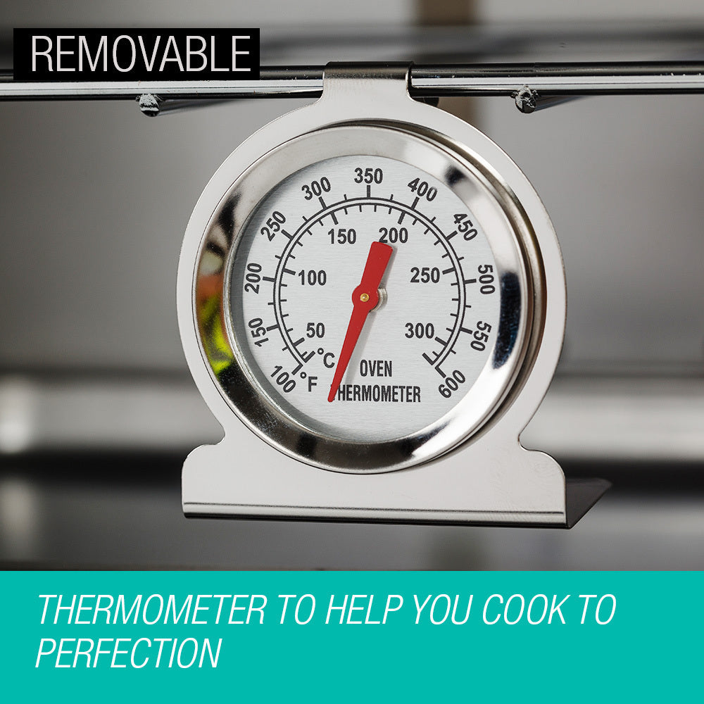 Made with quality stainless steel, you can be confident of the unit's durability. Featuring 5,300 BTU twin stove burners with non-stick enamel surface, a 3500 BTU oven with dual racks, removable oven thermometer and a bonus roasting tray, the Thermomate Outdoor Camping Oven has thoughtfully included everything you need to create a home cooked meal outdoors. The folding lid and arms will shelter heat from wind while cooking. Cleverly designed, it is powerful yet compact, weighing only 15kg, ensuring easy transportation and storage.