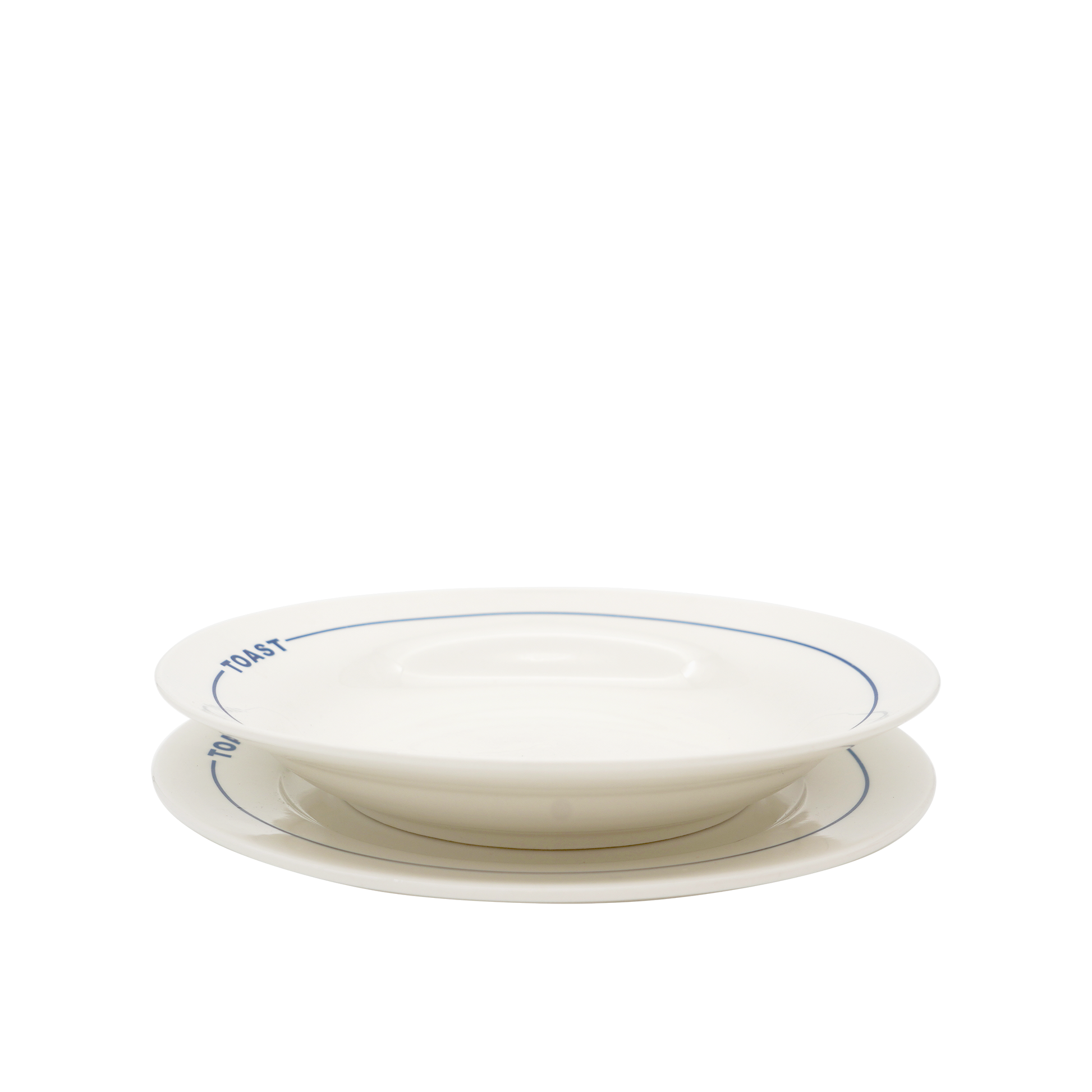 This porcelain plate is an exceptional showcase of innovative minimalist design and traditional crafting methods. It features with an ivory colour background a blue bands around the edge, which is suitable for most tabletop environments.