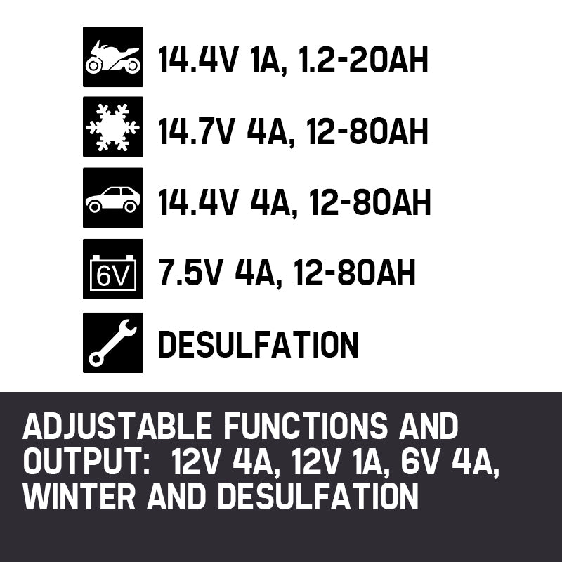 Unlike other intelligent battery chargers on the market, the New X-Cell i94 Smart Battery Charger has integrated a 9 step fully automatic charging cycle coupled with an internal microprocessor to ensure your battery receives a state of the art charging program. It’s equipped with a host of intelligent features such as controlled peak voltage to eliminate the risk of overcharging and a spark proof design for superior safety. The adjustable functions and output make the unit compatible for multiple battery types catering to a variety of programs - 12V 4A, 12V 1A, 6V 4A, Winter and Desulfation. Moreover, with the cig connector plug you can charge your battery from the inside of your vehicle by simply connecting the charger directly into your vehicle's cigarette lighter receptacle.